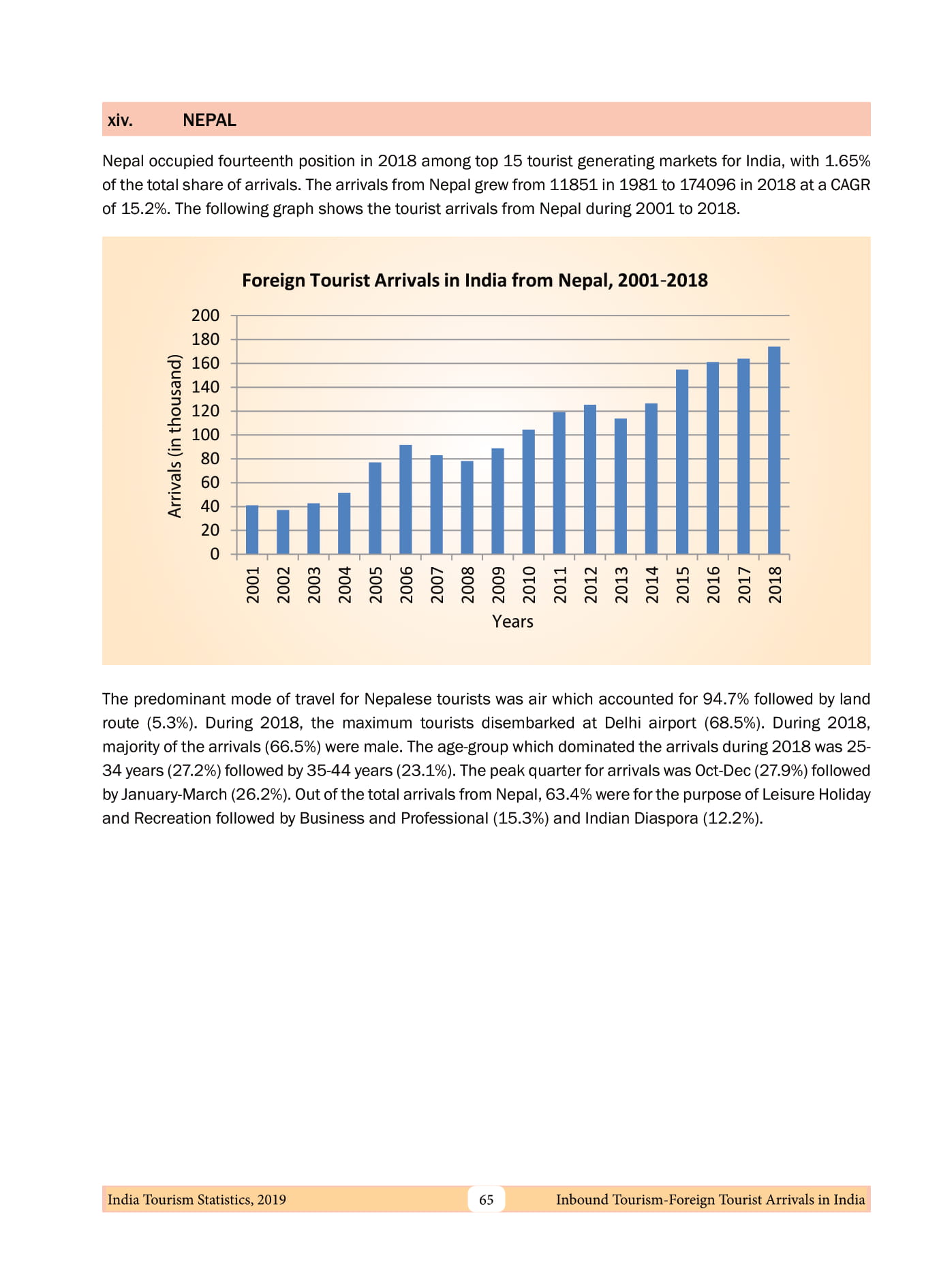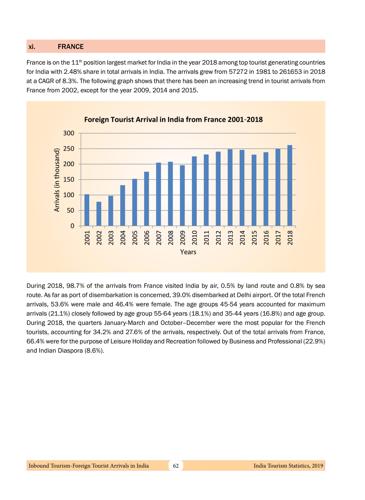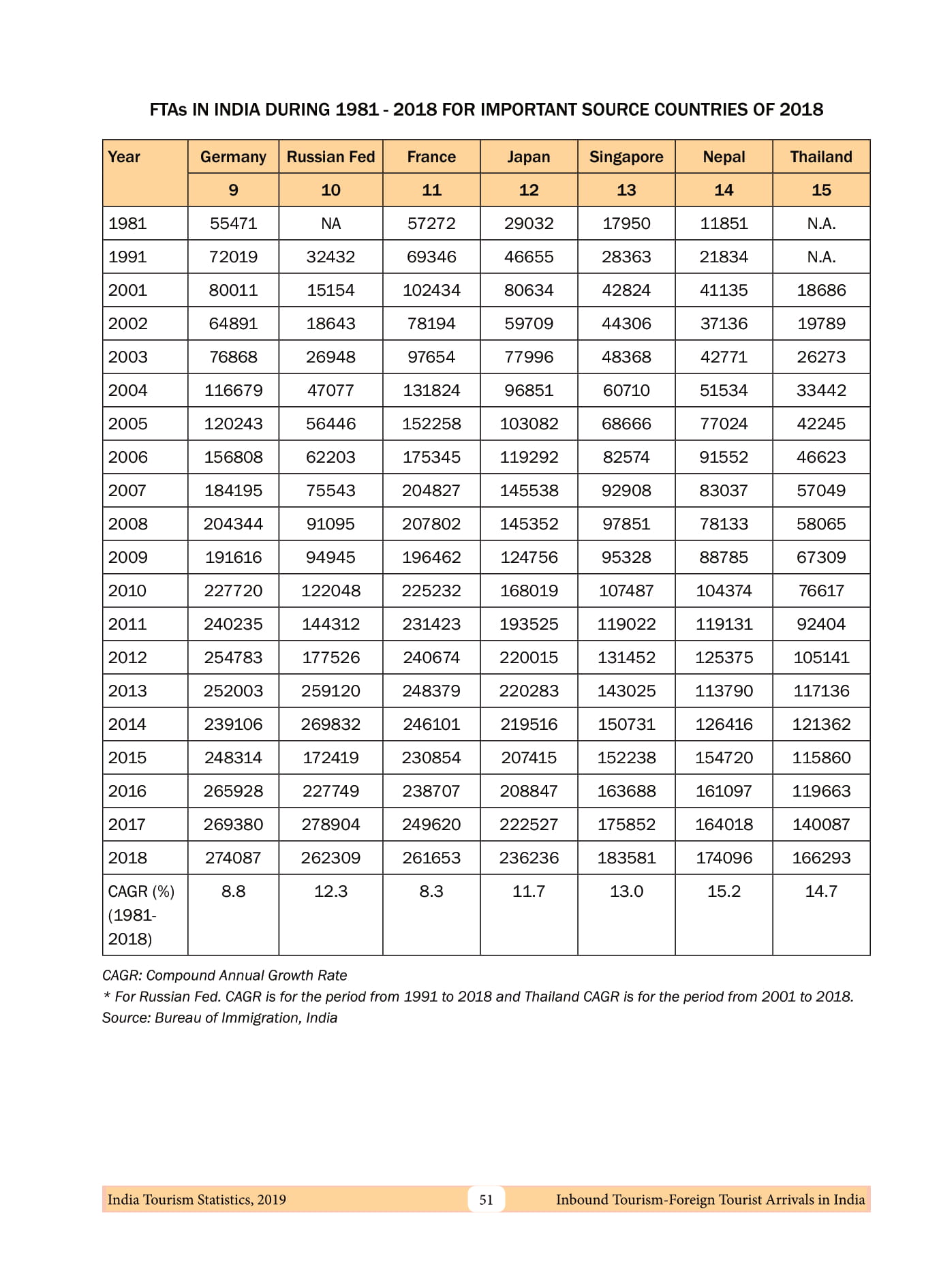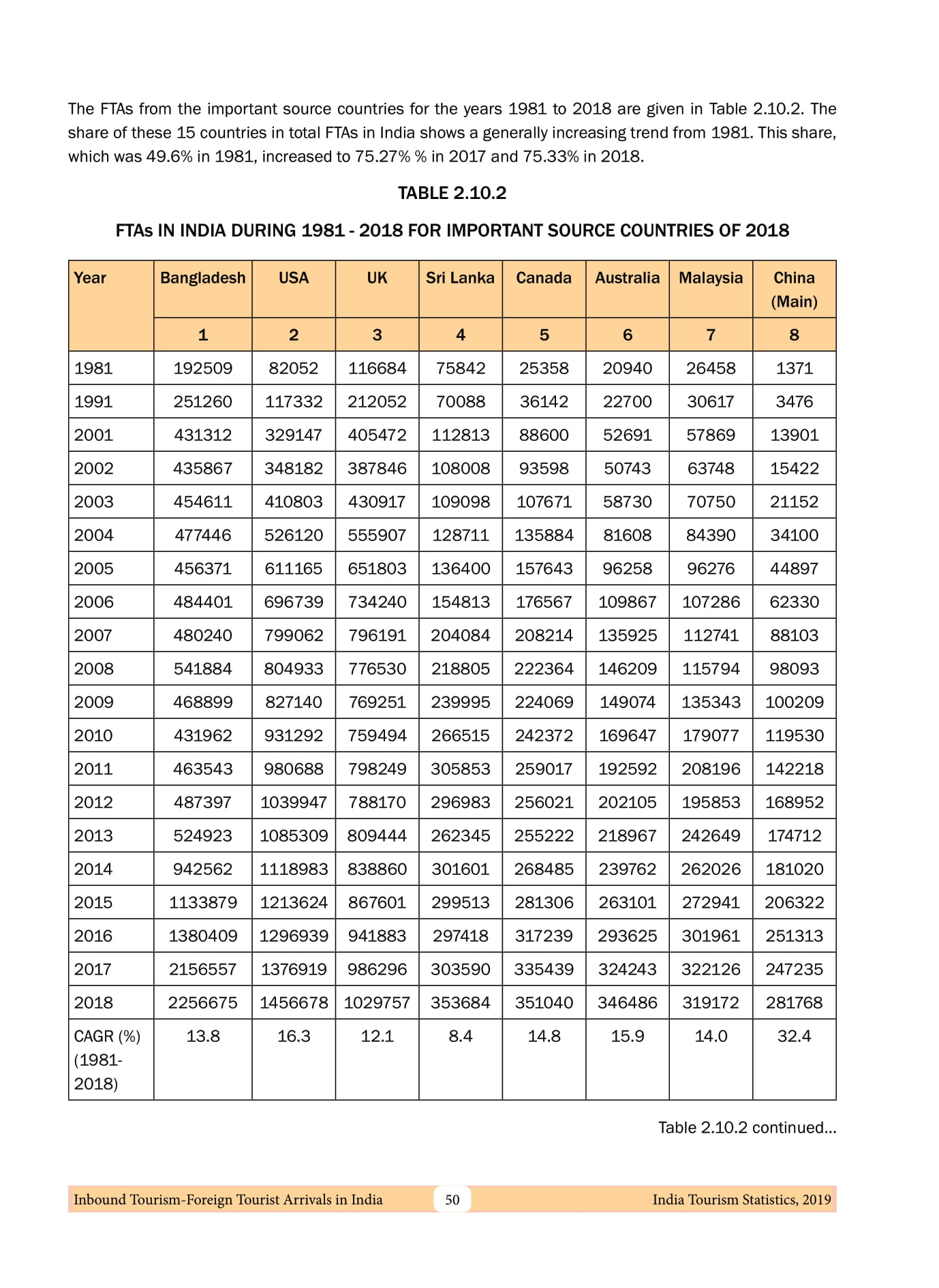 2018年,在印度最大的旅游来源国中,中国是第八大市场,占总入境人数的2.67%。1981年,来自中国的入境人数仅为1371人,2018年增长到281768人,复合年均增长率为32.4%。