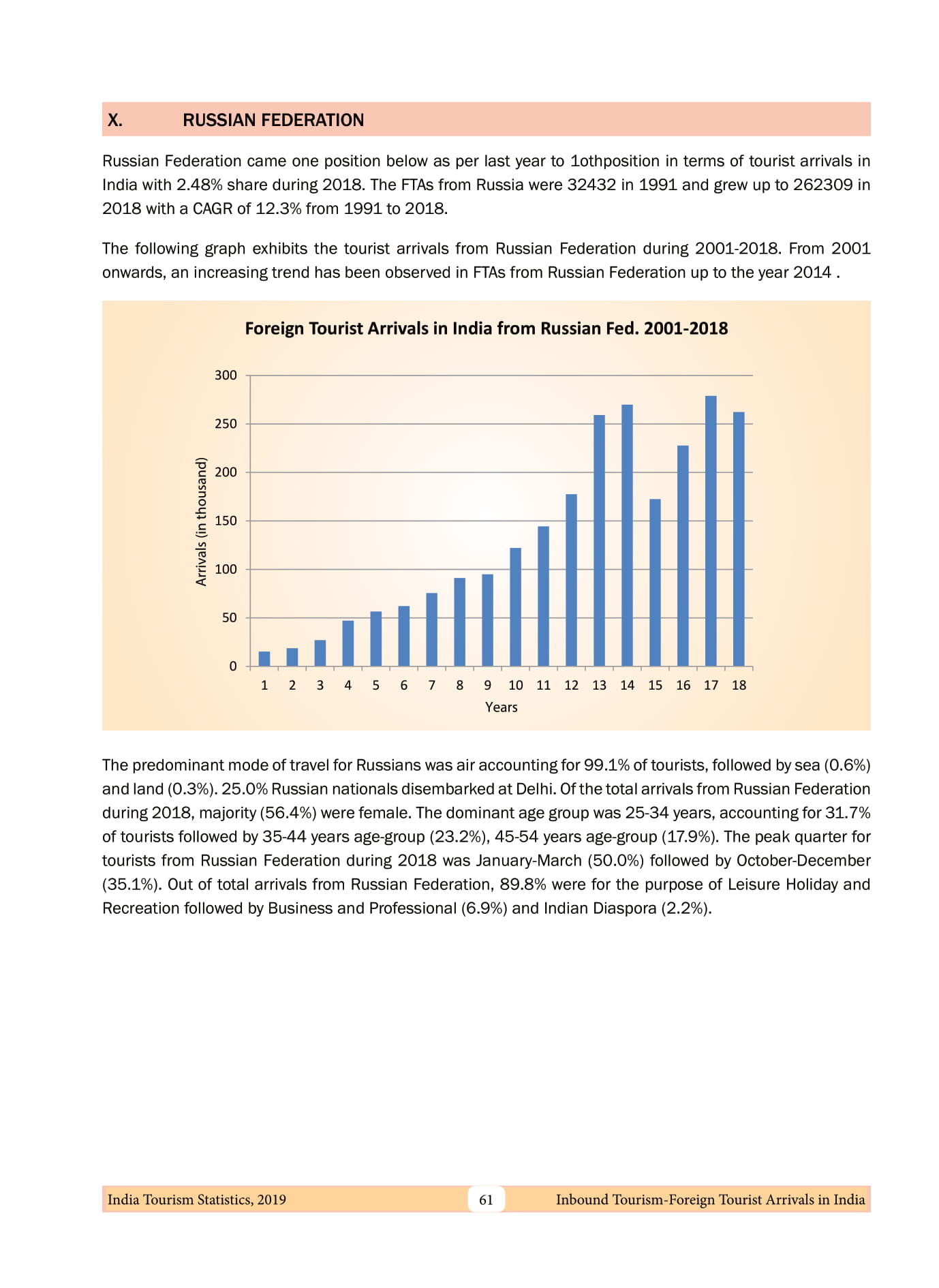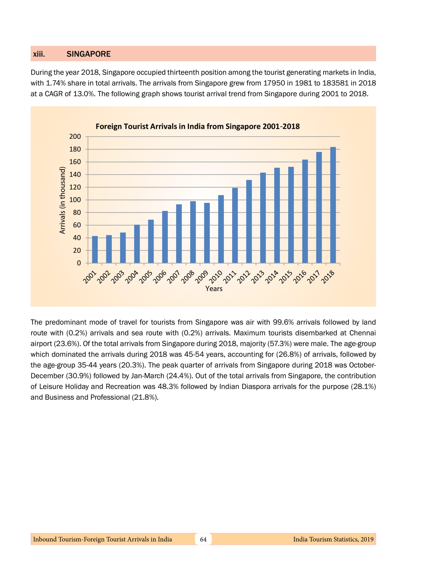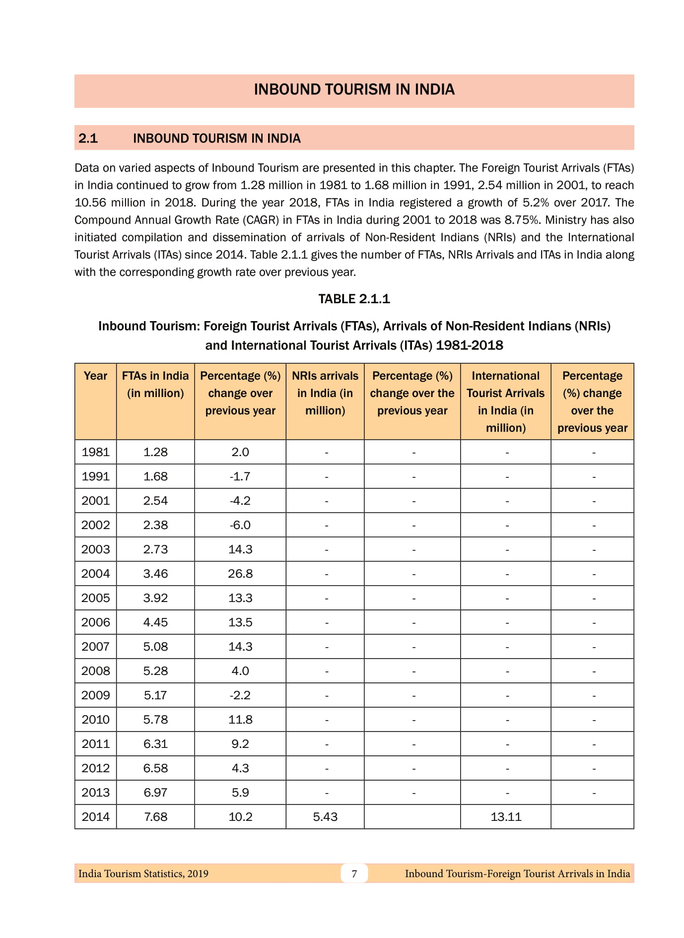 2018年,在印度最大的旅游来源国中,中国是第八大市场,占总入境人数的2.67%。1981年,来自中国的入境人数仅为1371人,2018年增长到281768人,复合年均增长率为32.4%。