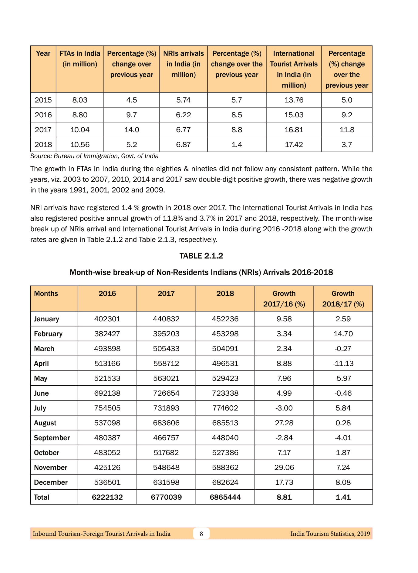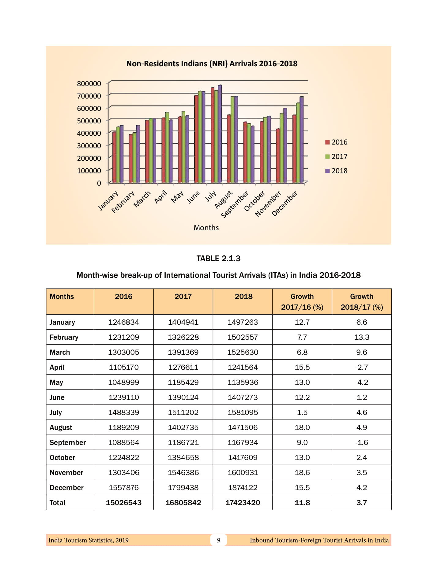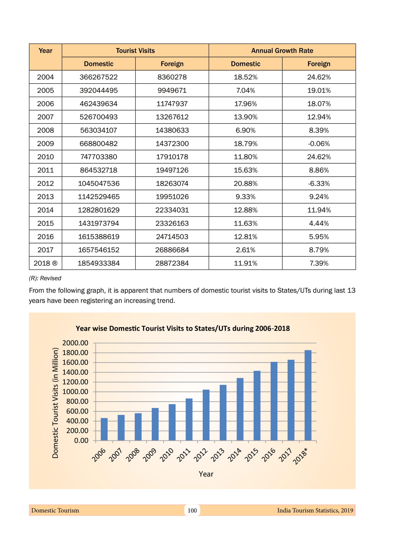 2018年印度国内旅游人次为1.854亿人次,2017年为1.657亿人次,增长率为11.9%。