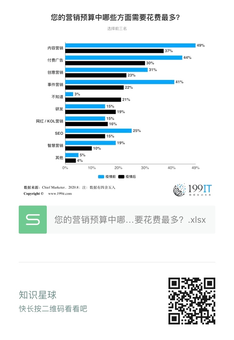 您的营销预算中哪些方面需要花费最多?(附原数据表) 更多阅读:哪些方面的营销预算2020年将获得比2019年更多的资金?(附原数据表) 用于现场活动的资金重新分配到营销预算的哪些方面?(附原数据表) 2020年,您的营销预算是?(附原数据表) 您的营销预算的哪些方面提供了最多的ROI?(附原数据表) Econsultancy:今年超过半数营销人员将增加社交媒体和内容营销预算AdMaster&R3:2012年中国汽车广告主将增加超过32%营销预算投放在数字媒体IPA Bellwether:2020年第三季度英国营销预算继续缩减Digiday:2022年Instagram营销预算和信心调查Braze:2021年客户参与报告CMI:2021年B2B内容营销报告SCOPEN:数字占英国营销预算的40%以上TheDrum:在家工作为主题的Spotify播放列表增长1400%以上Chief Marketer:COVID-19营销展望报告社会化媒体广告现状–数据信息图Ignite Visibility:2021-2023年广告支出调查报告