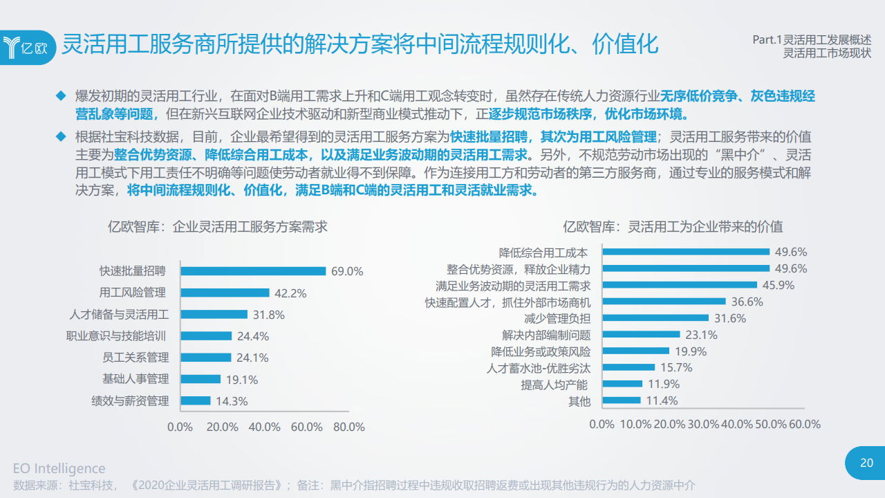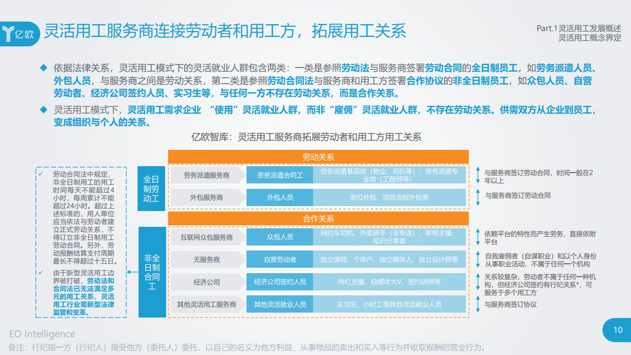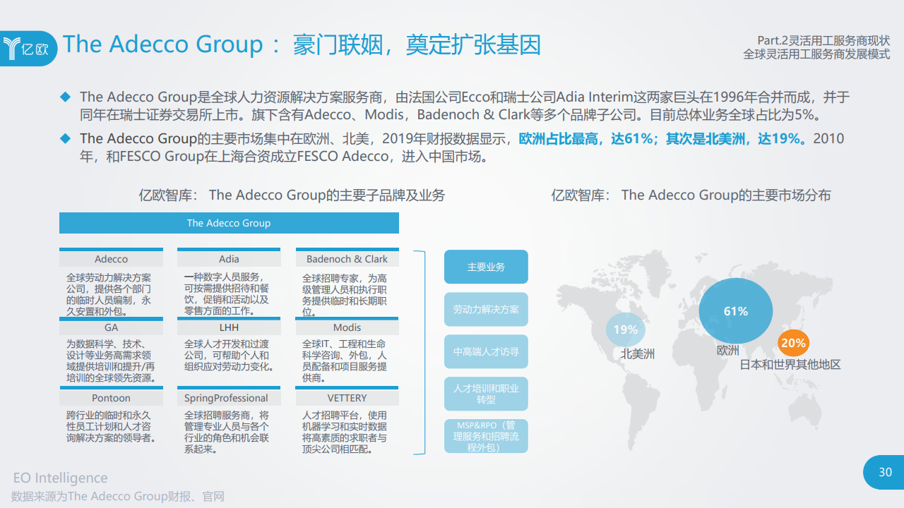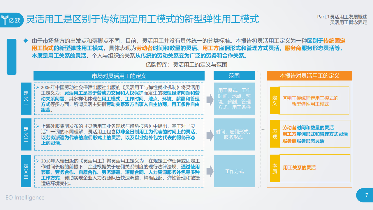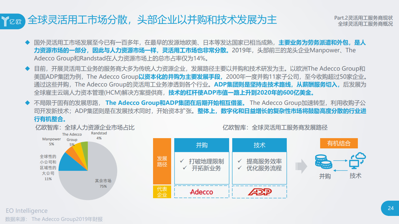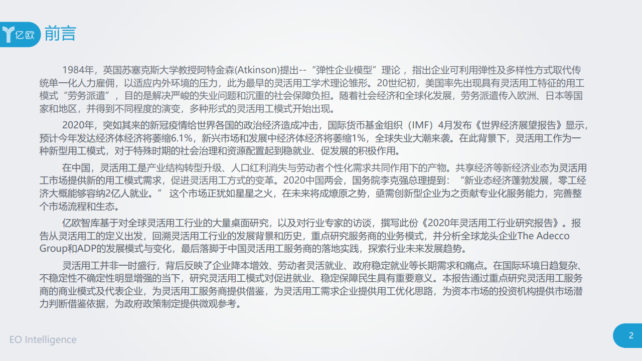 亿欧智库基于对全球灵活用工行业的大量桌面研究,以及对行业专家的访谈,撰写此份《2020年灵活用工行业研究报告》。报告从灵活用工的定义出发,回溯灵活用工行业的发展背景和历史,重点研究服务商的业务模式,并分析全球龙头企业The Adecco Group和ADP的发展模式与变化,最后落脚于中国灵活用工服务商的落地实践,探索行业未来发展趋势。