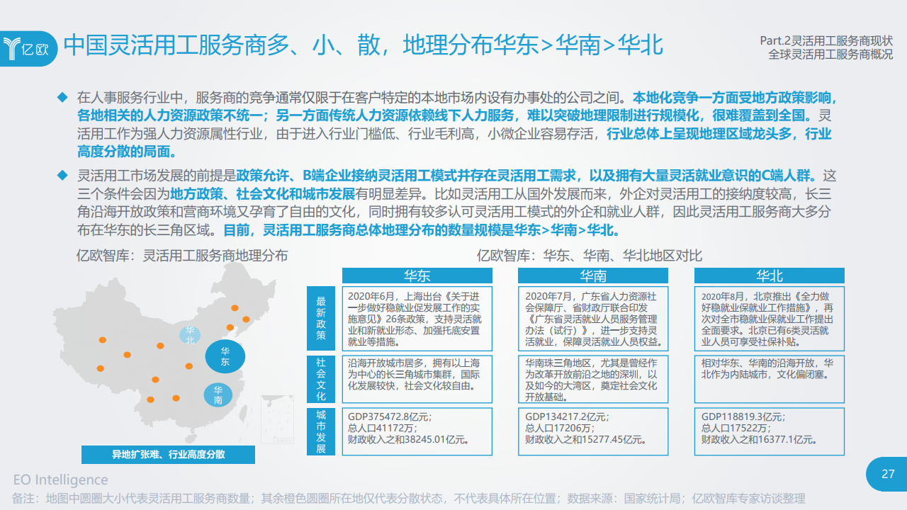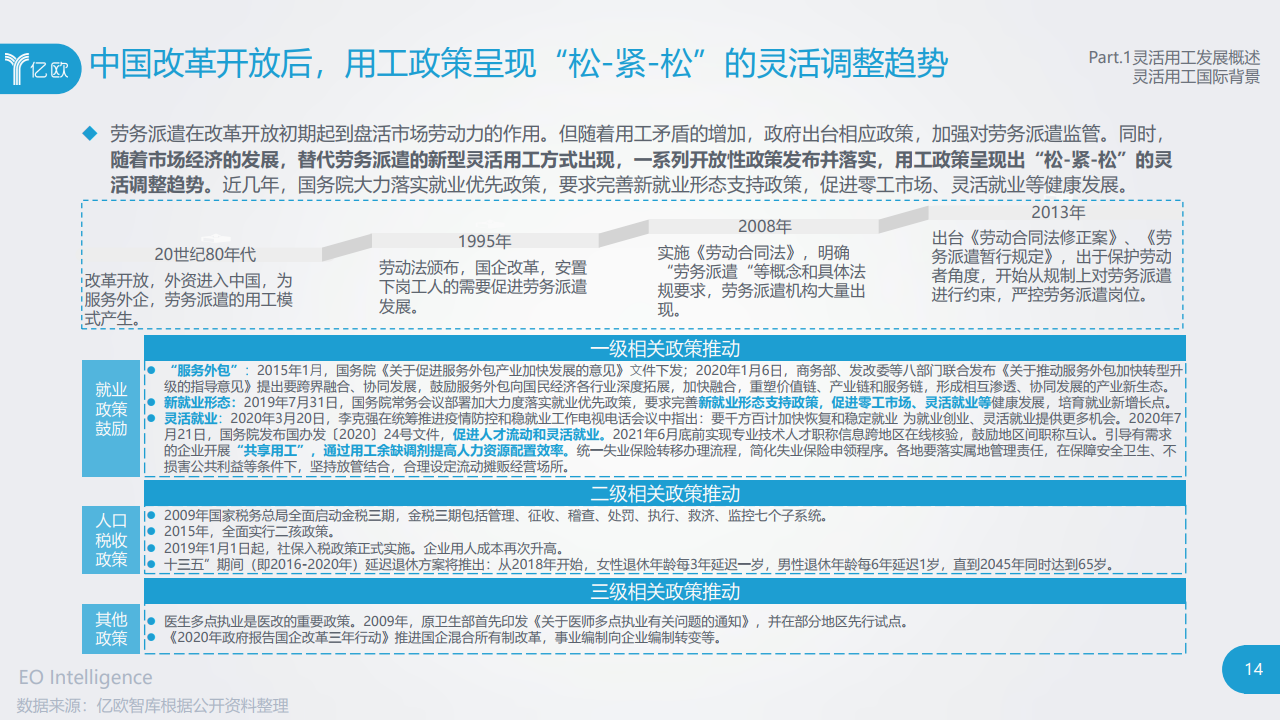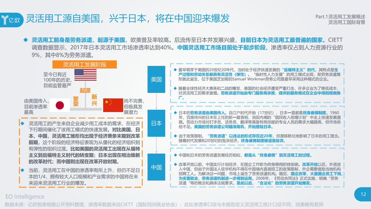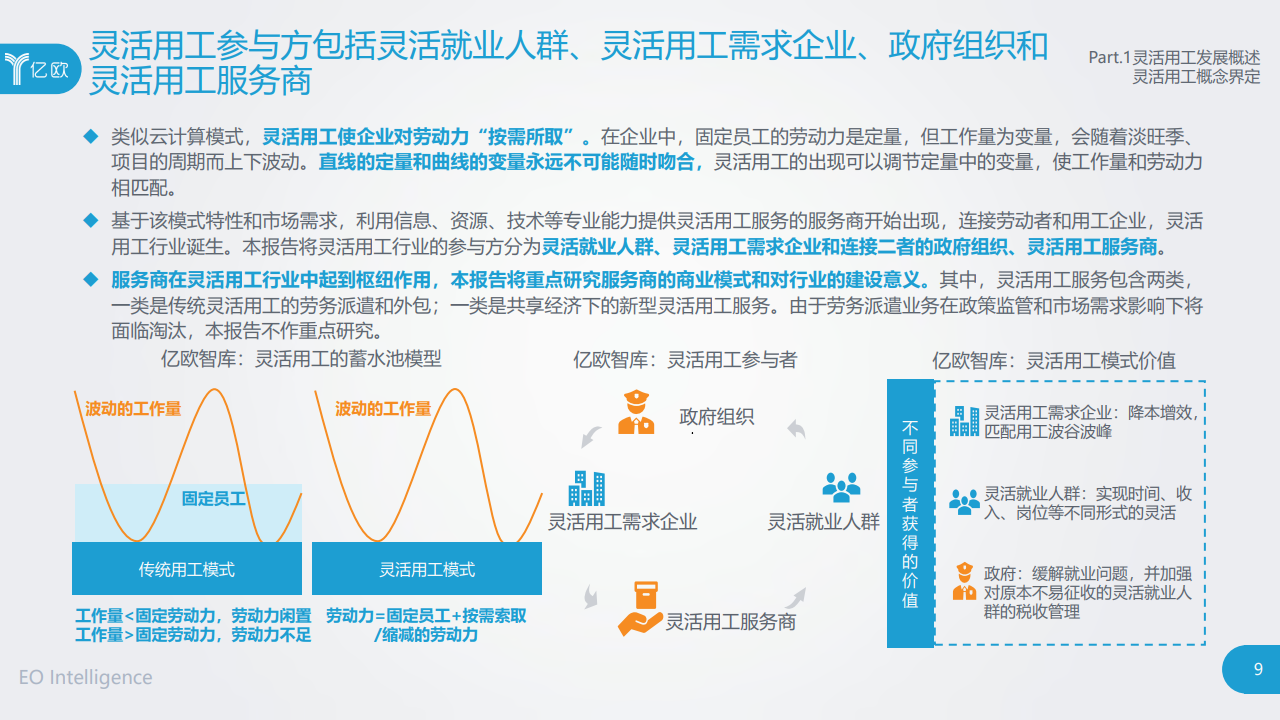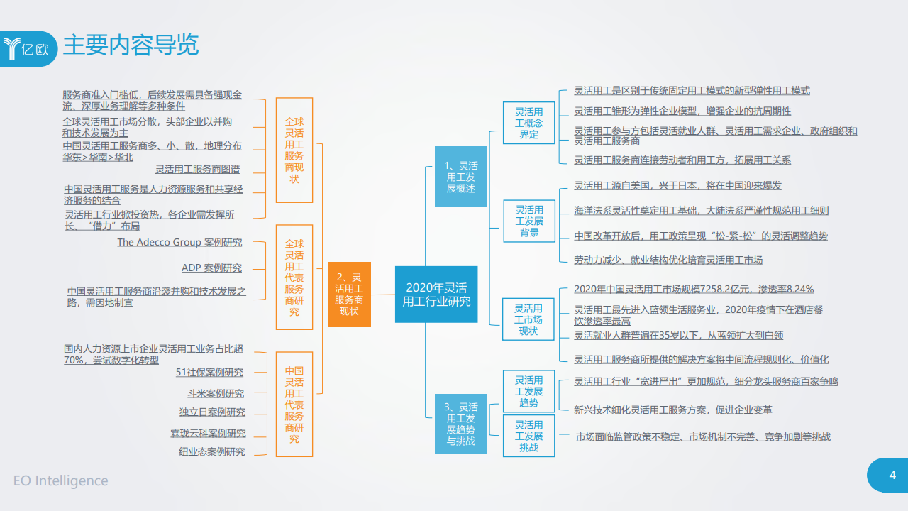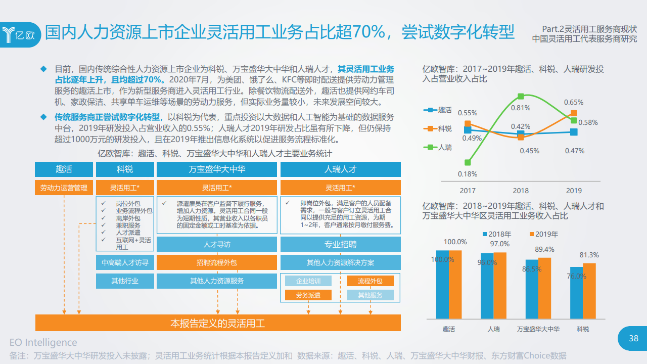 亿欧智库基于对全球灵活用工行业的大量桌面研究,以及对行业专家的访谈,撰写此份《2020年灵活用工行业研究报告》。报告从灵活用工的定义出发,回溯灵活用工行业的发展背景和历史,重点研究服务商的业务模式,并分析全球龙头企业The Adecco Group和ADP的发展模式与变化,最后落脚于中国灵活用工服务商的落地实践,探索行业未来发展趋势。