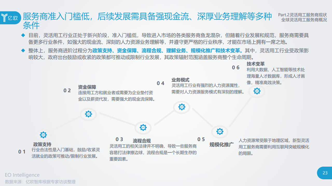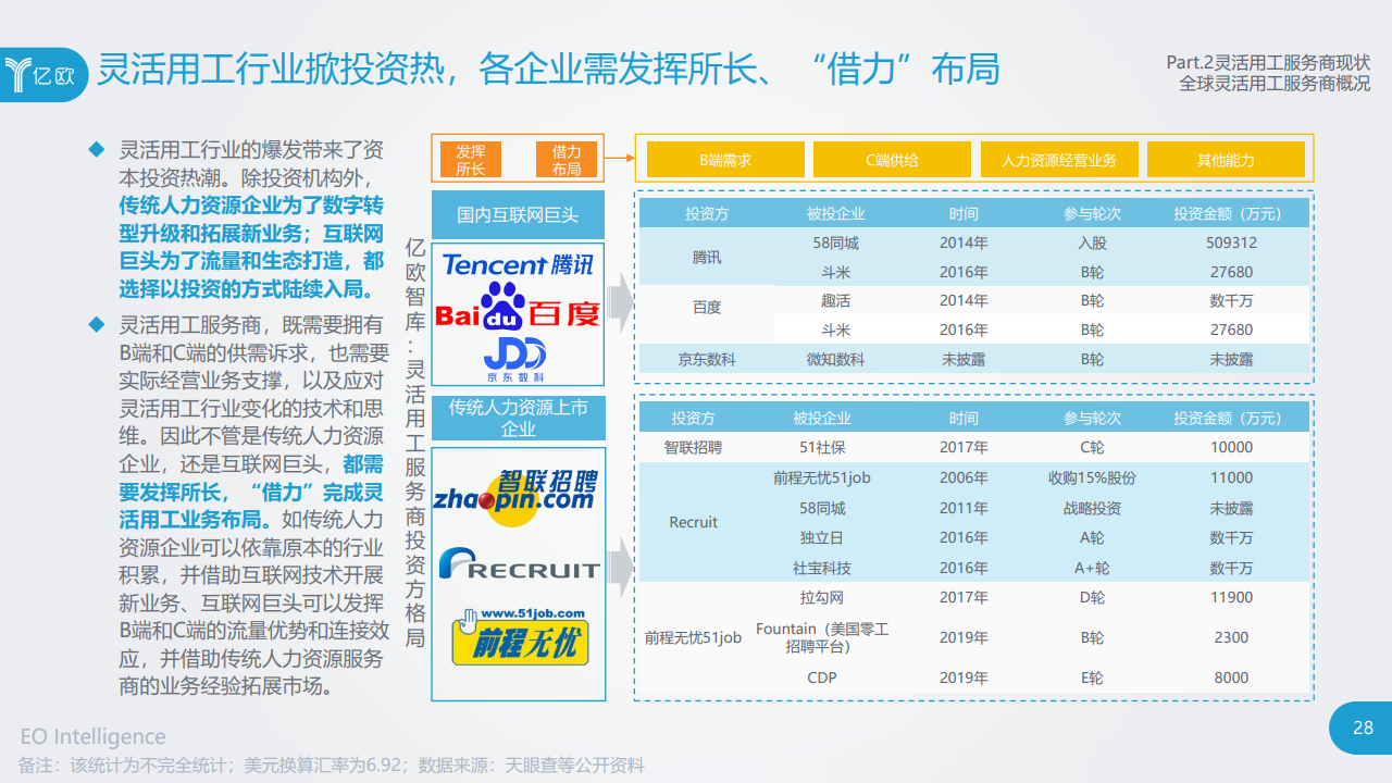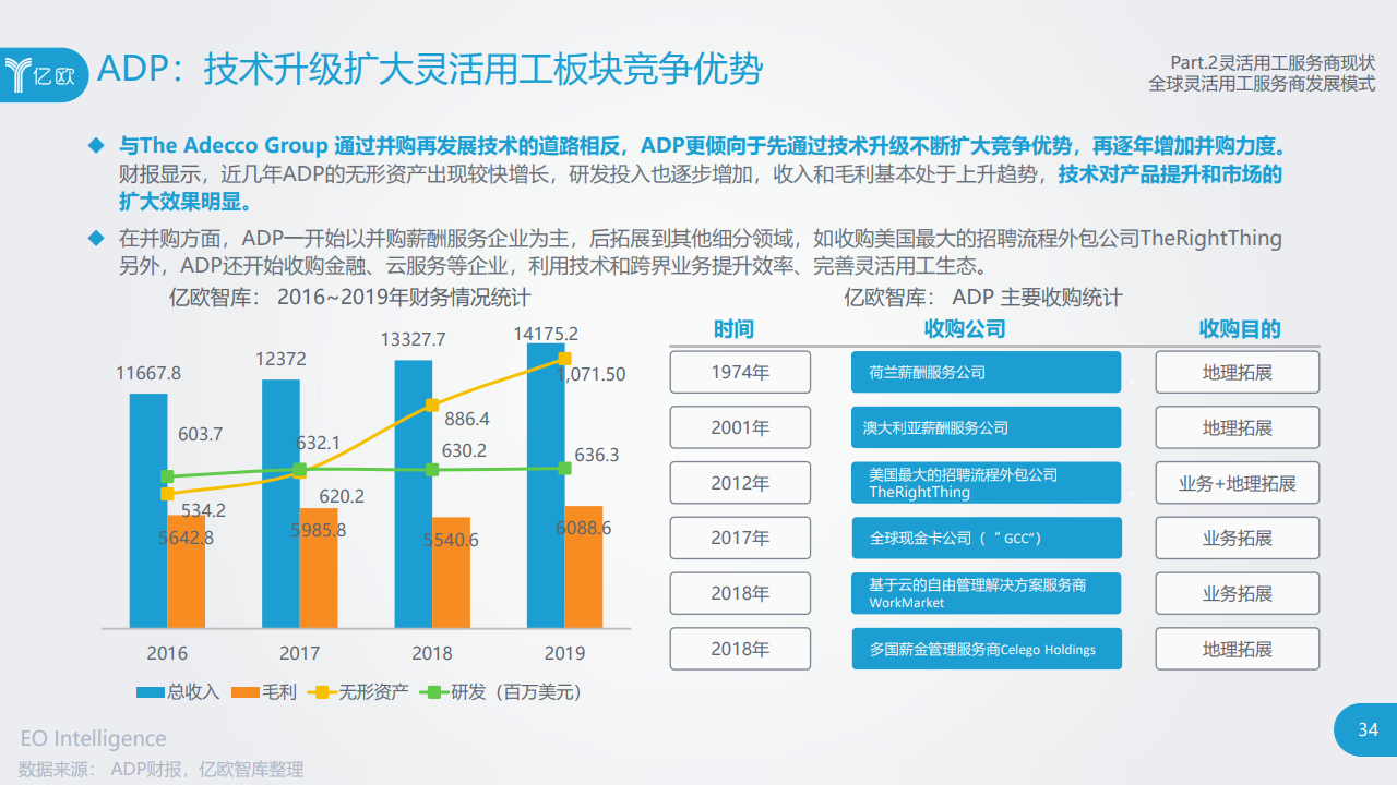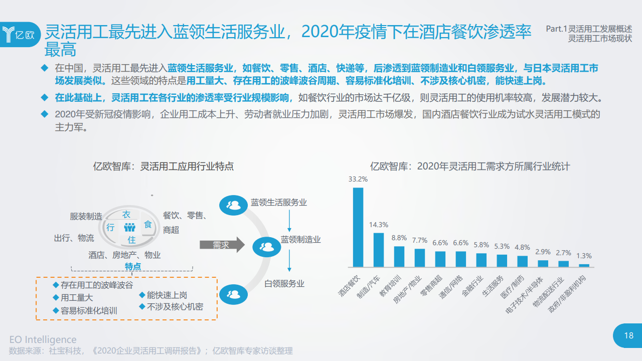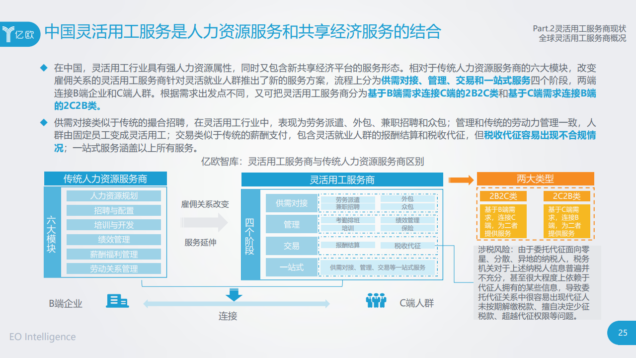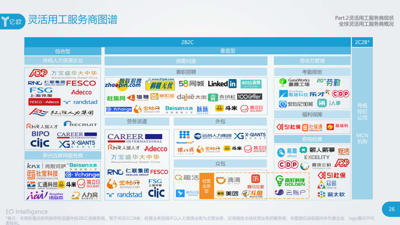 亿欧智库基于对全球灵活用工行业的大量桌面研究,以及对行业专家的访谈,撰写此份《2020年灵活用工行业研究报告》。报告从灵活用工的定义出发,回溯灵活用工行业的发展背景和历史,重点研究服务商的业务模式,并分析全球龙头企业The Adecco Group和ADP的发展模式与变化,最后落脚于中国灵活用工服务商的落地实践,探索行业未来发展趋势。