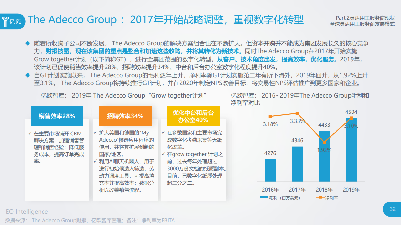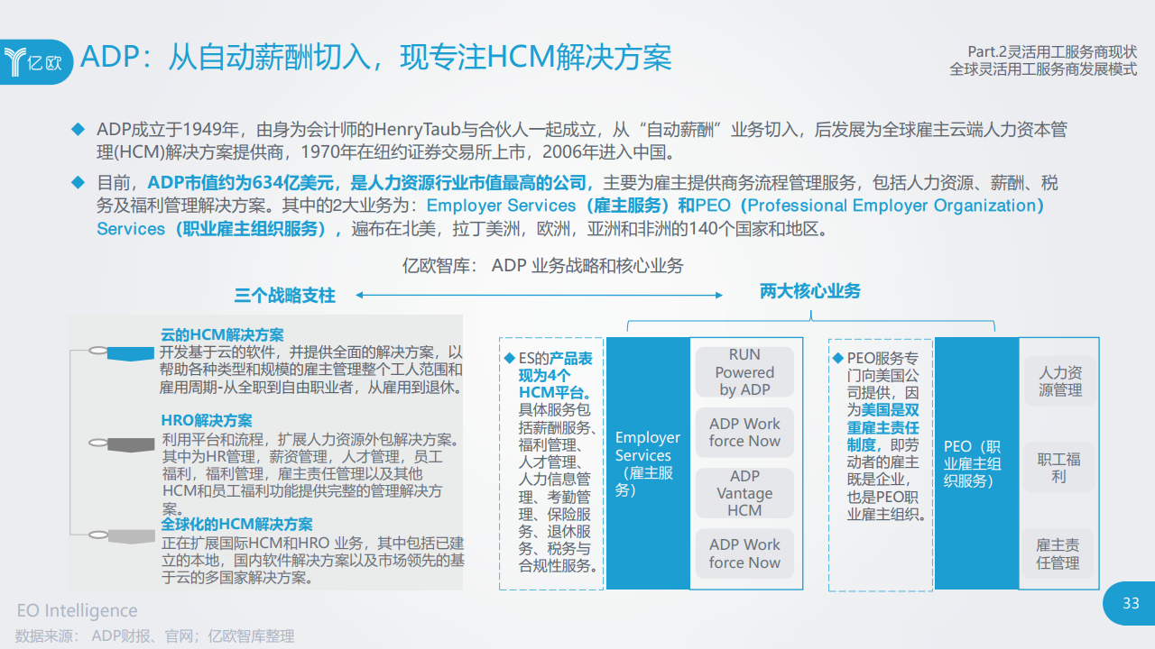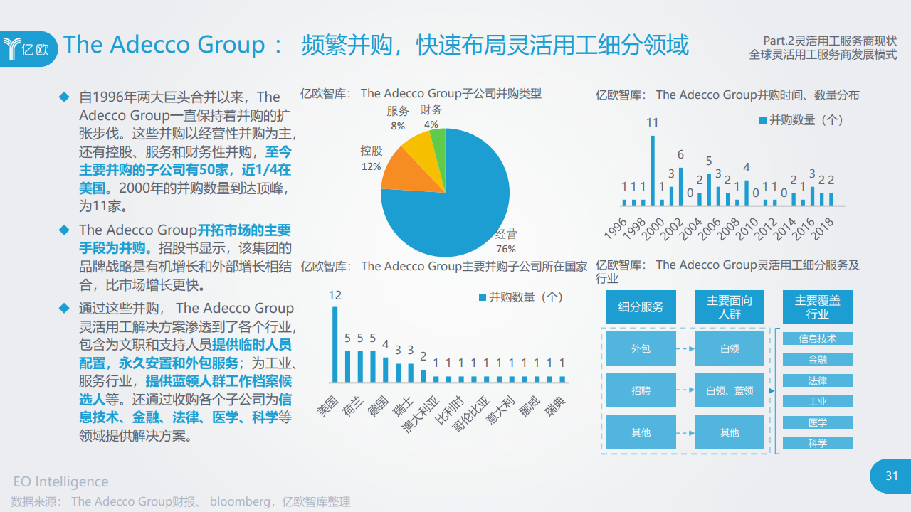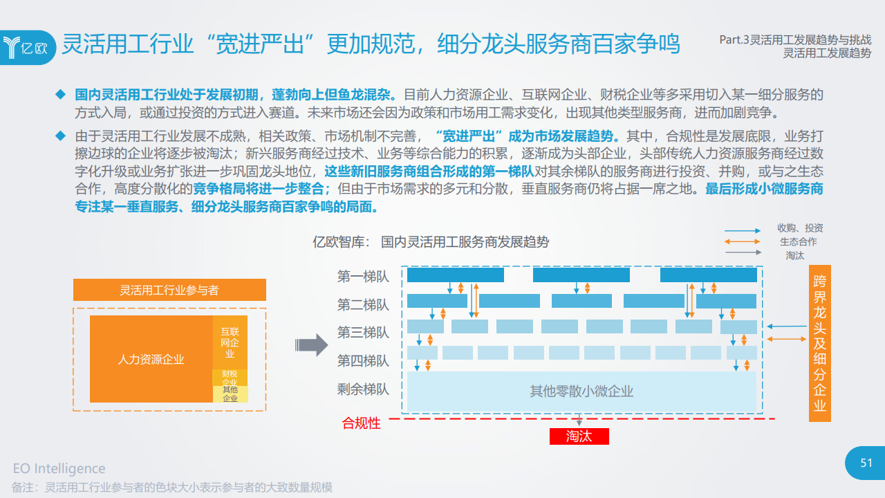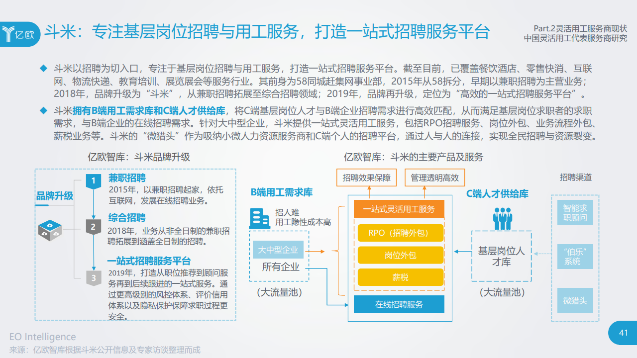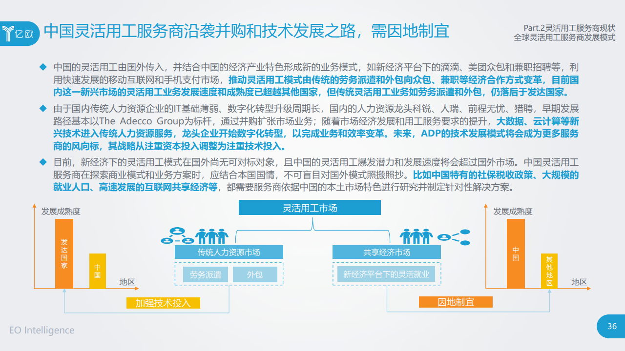 亿欧智库基于对全球灵活用工行业的大量桌面研究,以及对行业专家的访谈,撰写此份《2020年灵活用工行业研究报告》。报告从灵活用工的定义出发,回溯灵活用工行业的发展背景和历史,重点研究服务商的业务模式,并分析全球龙头企业The Adecco Group和ADP的发展模式与变化,最后落脚于中国灵活用工服务商的落地实践,探索行业未来发展趋势。