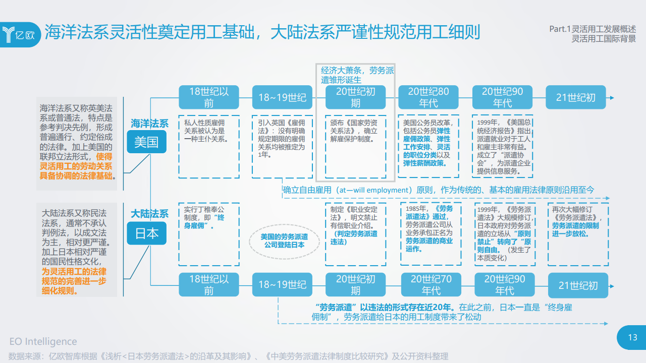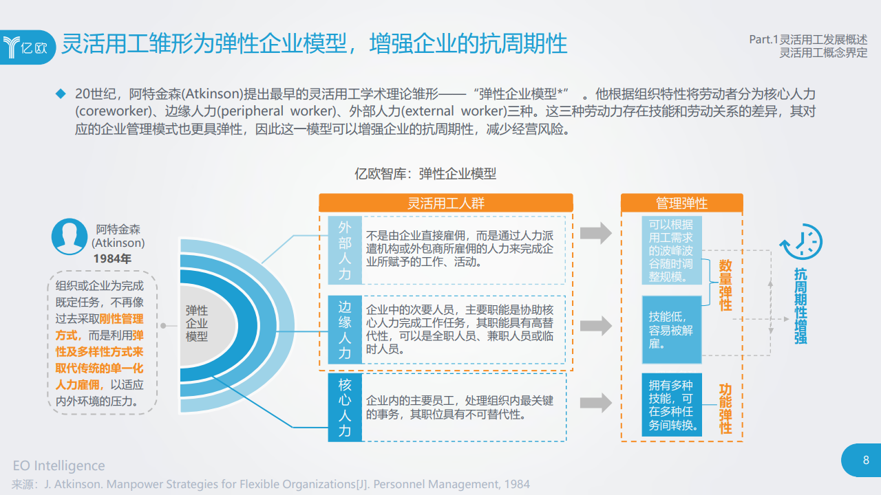 1984年,英国苏塞克斯大学教授阿特金森(Atkinson)提出—“弹性企业模型”理论 ,指出企业可利用弹性及多样性方式取代传统单一化人力雇佣,以适应内外环境的压力,此为最早的灵活用工学术理论雏形。20世纪初,美国率先出现具有灵活用工特征的用工模式“劳务派遣”,目的是解决严峻的失业问题和沉重的社会保障负担。随着社会经济和全球化发展,劳务派遣传入欧洲、日本等国家和地区,并得到不同程度的演变,多种形式的灵活用工模式开始出现。