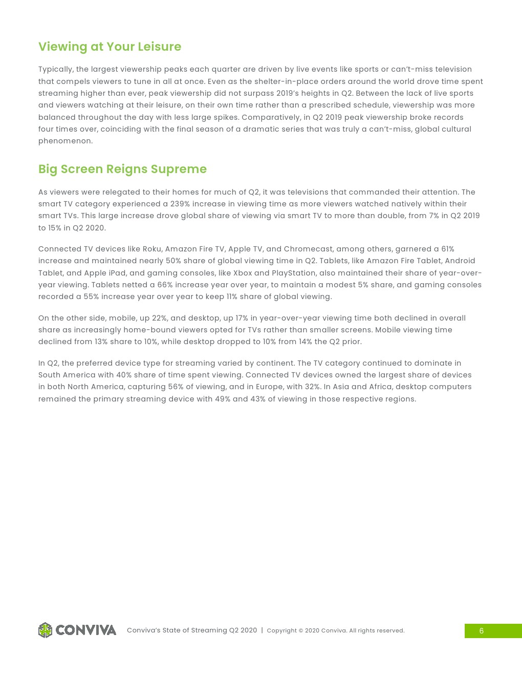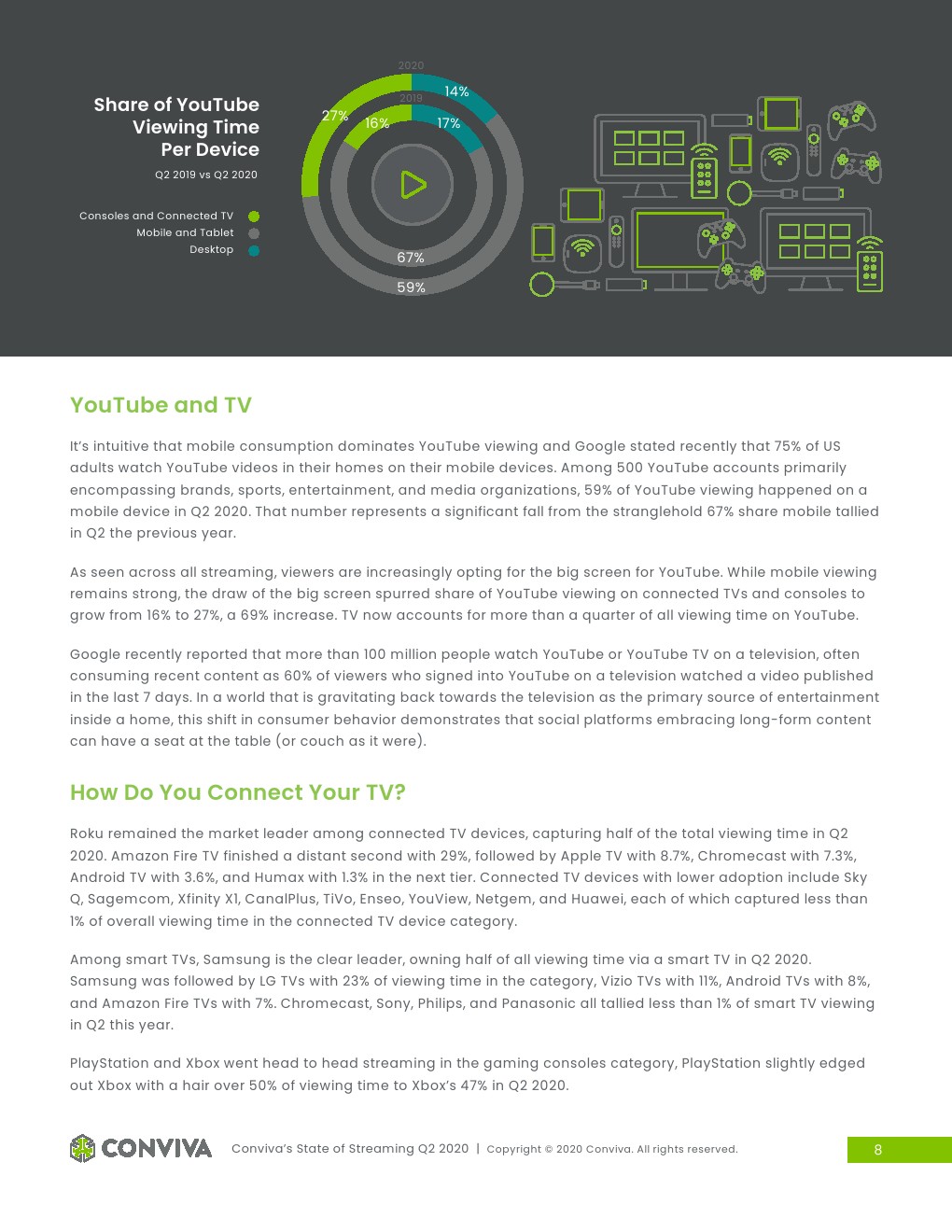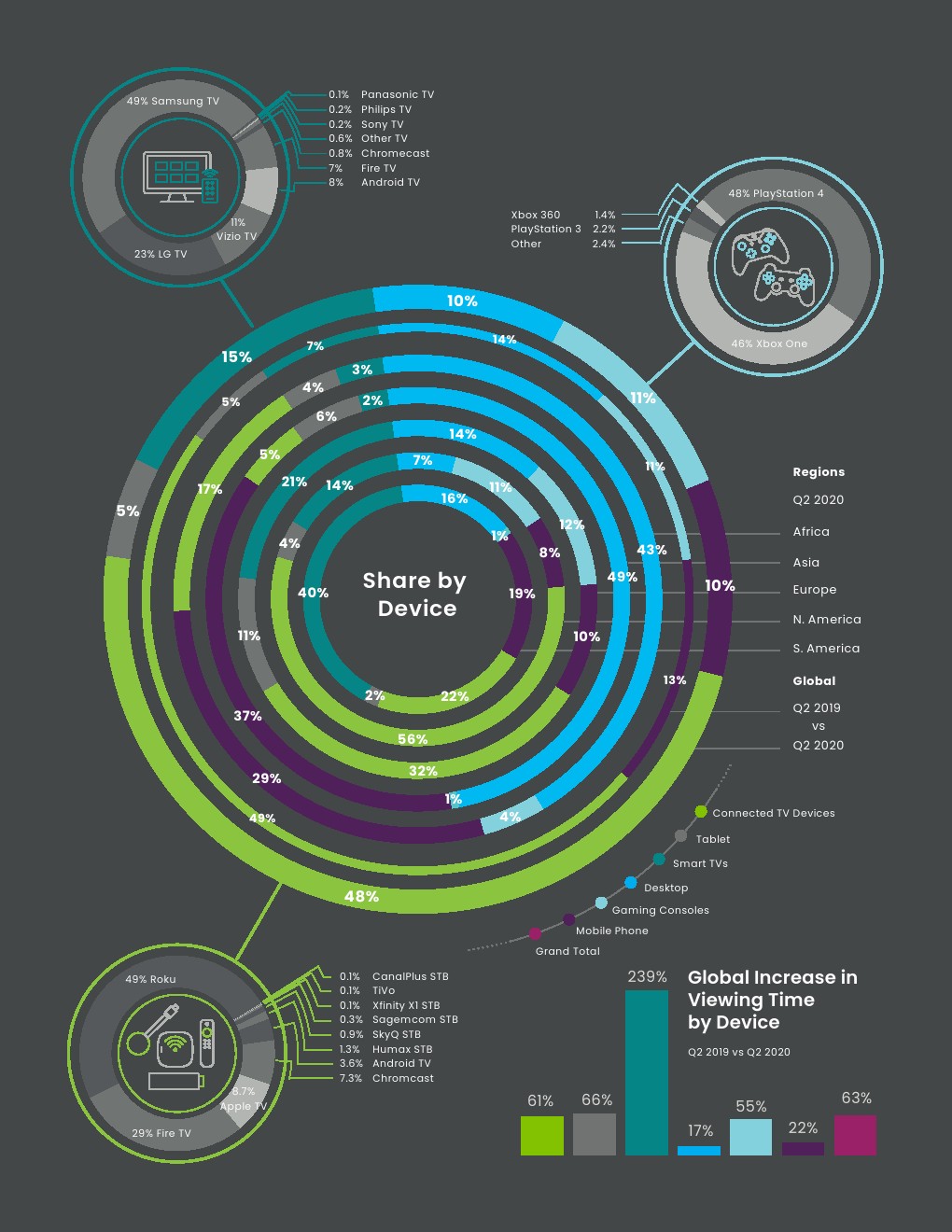 - 智能电视的观看时间增长了239%。智能电视收视的全球份额翻了一番多,从2019年第二季度的7%上升到2020年第二季度的15%。