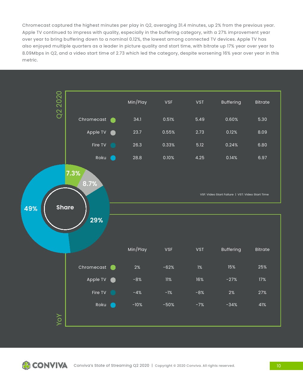 - 以Roku、亚马逊Fire TV、Apple TV和Chromecast为首的联网电视服务以61%的增长率主导了流媒体收视,在第二季度保持了近50%的全球观看时间份额。领先者Roku和Fire TV并驾齐驱,分别增长63%,占该类别收视份额分别为49%和29%。