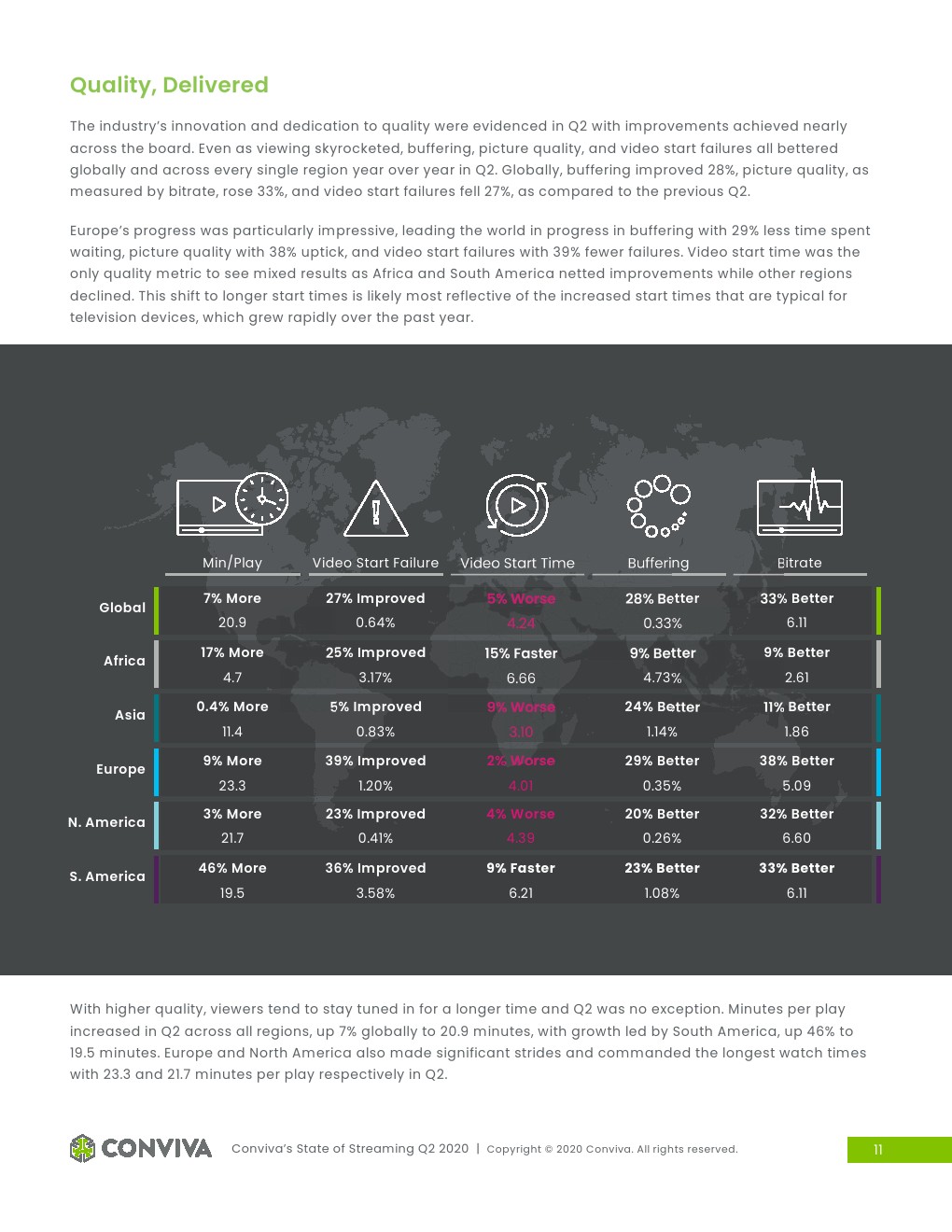 - 欧洲的流媒体时间增长居世界首位,仅在4月份就增长了174%,第二季度整体增长了134%。质量也有所提高,等待缓冲的时间减少了29%,画质提高了38%,视频启动失败减少了39%。