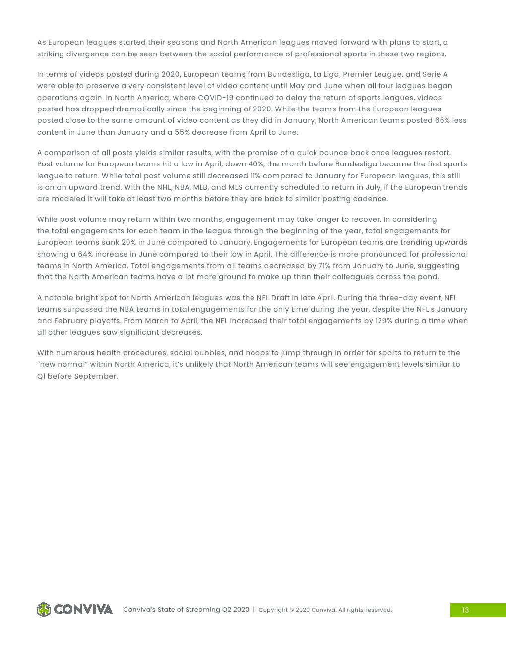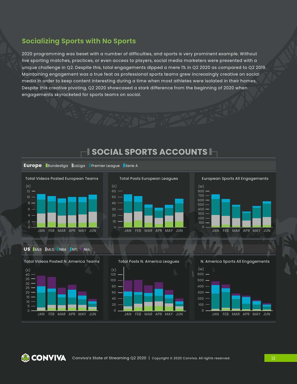 - 体育运动重返欧洲,与4月份的低点相比,6月有关体育的社交活动增长了64%。相反,北美职业体育的社交活动在6月份触底,比1月份下降了71%以上。