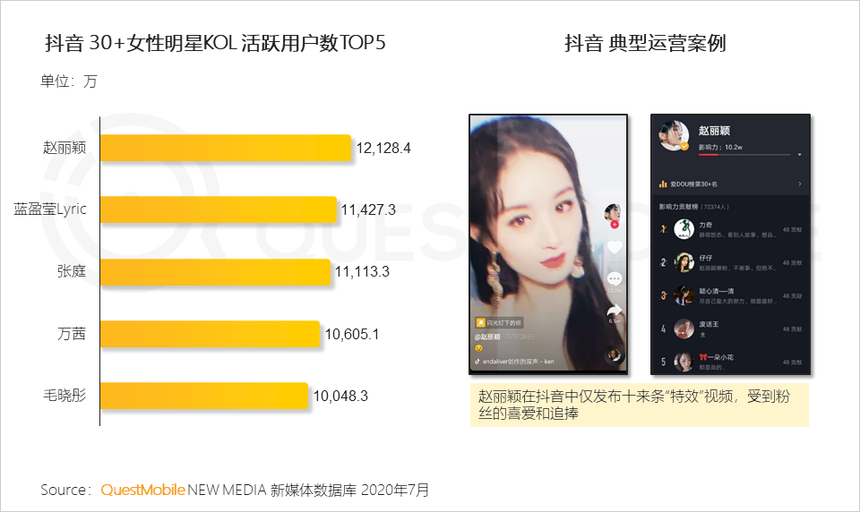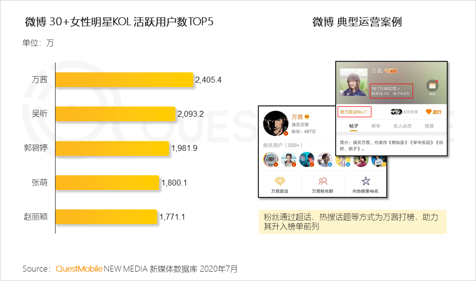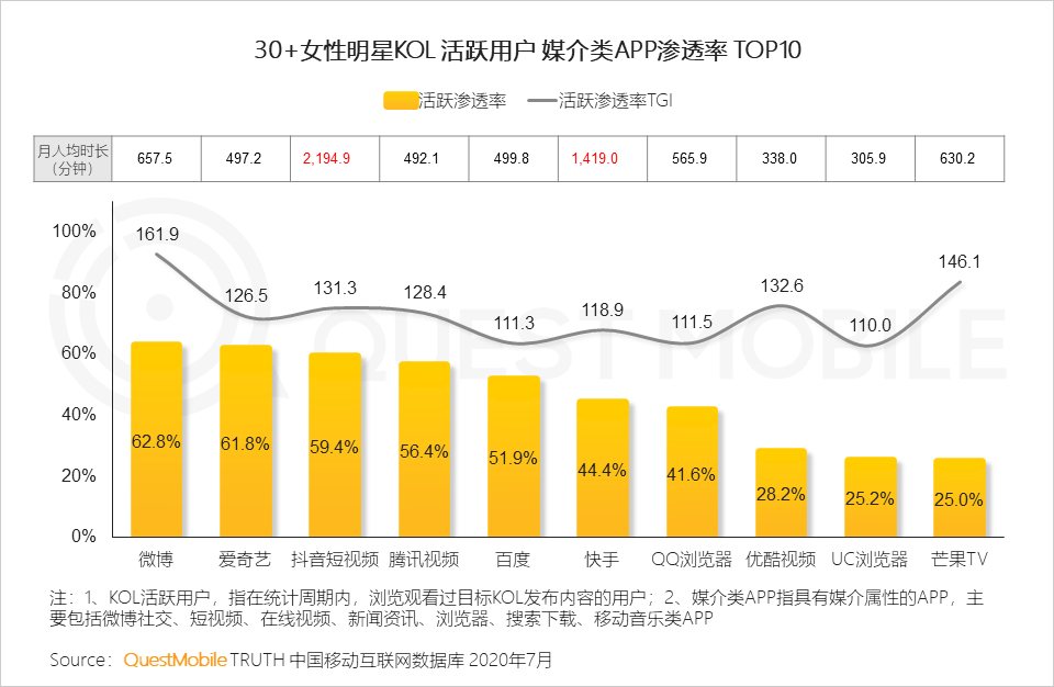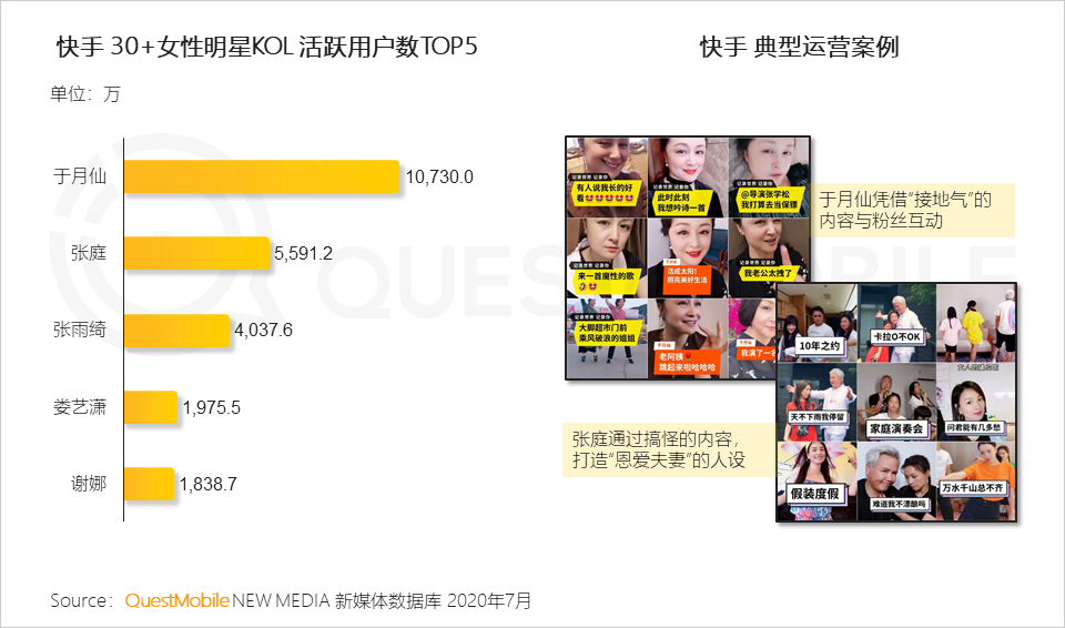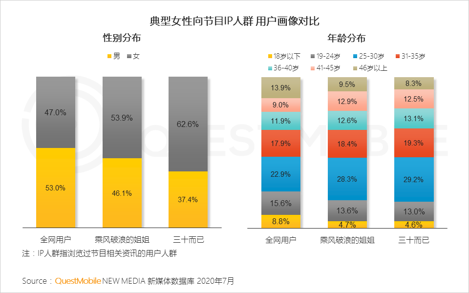 QuestMobile数据显示,过去几个月,从《乘风破浪的姐姐》《三十而已》开始,“女性群像”题材爆发,30+女明星KOL开始疯狂吸粉,尤其吸引了一线城市中青年女性(25-40岁之间用户占比接近六成),明星与节目的互相成就,也引发了流量叠加效应。