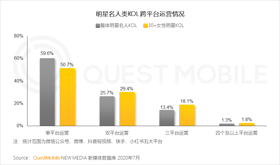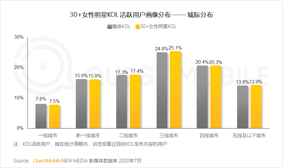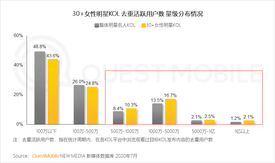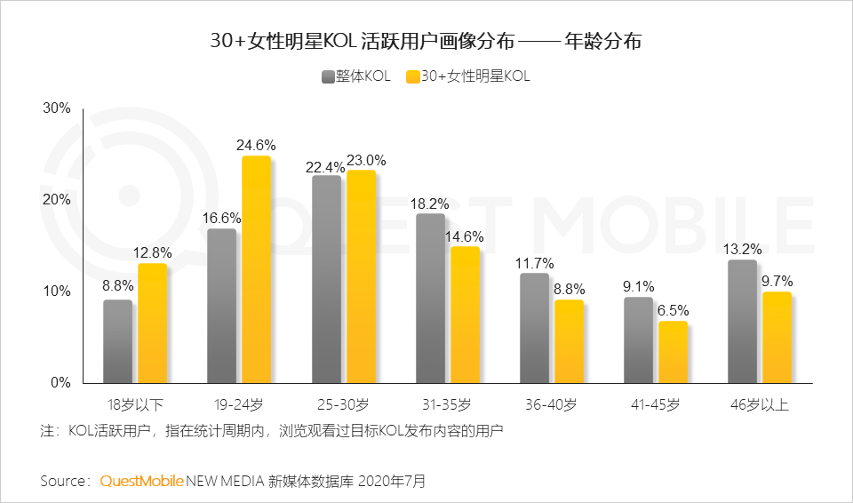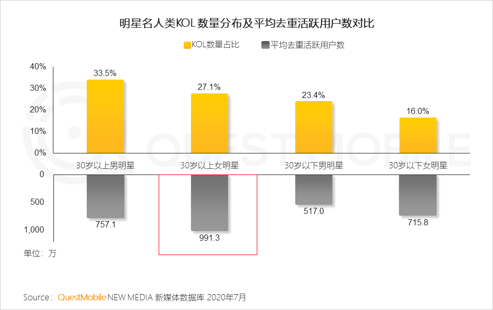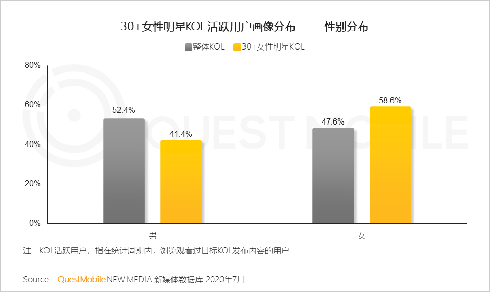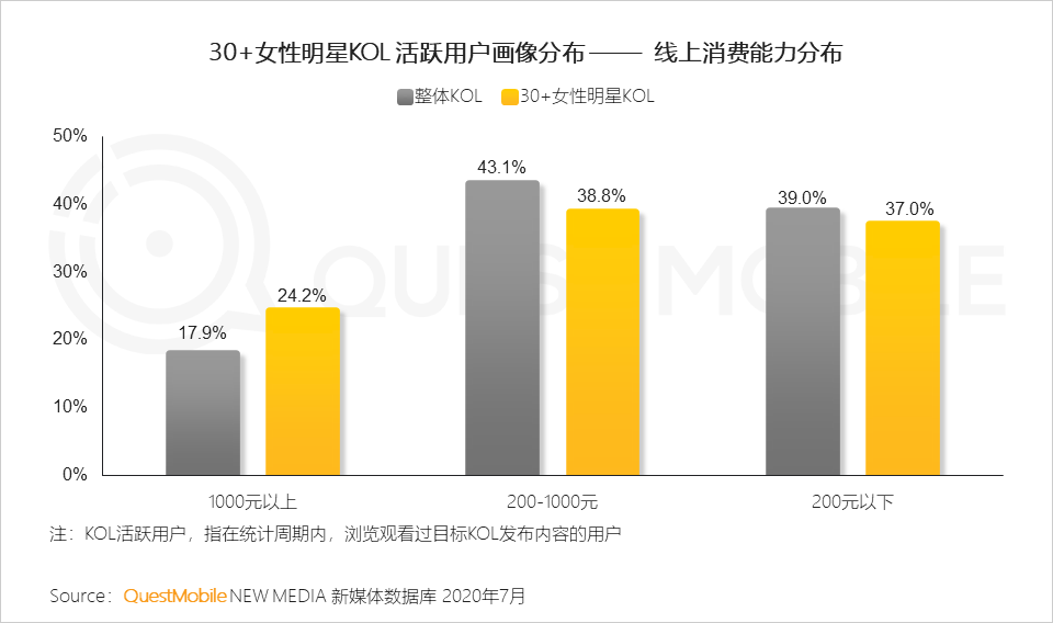一直以来,女明星受年龄影响远比男明星大,这一轮“国民级姐姐”崛起,带动了整个社交媒体关注度的翻转。截止到2020年7月, 30岁以上女明星KOL的平均活跃用户数已经超过了男明星和30岁以下的女明星。其活跃用户数中,30岁以下女性占比,也高出整体明星活跃用户数占比10%以上,较高消费能力人群(1000元以上)同样高出整体7%左右。