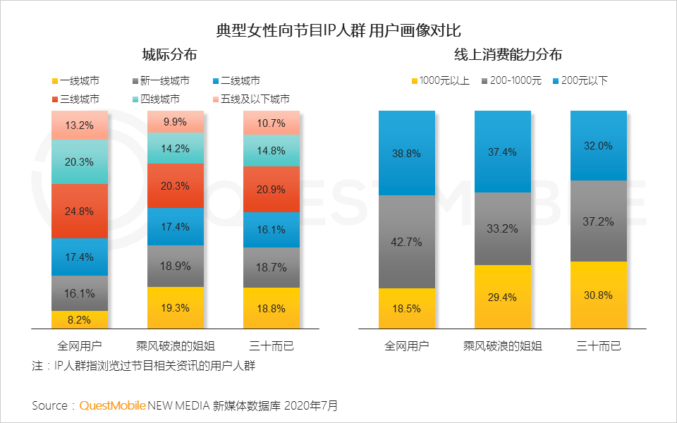 1.2 女性成长题材的IP主要吸引了中青年女性,中高端消费能力、一线城市受众比例高于整体大盘