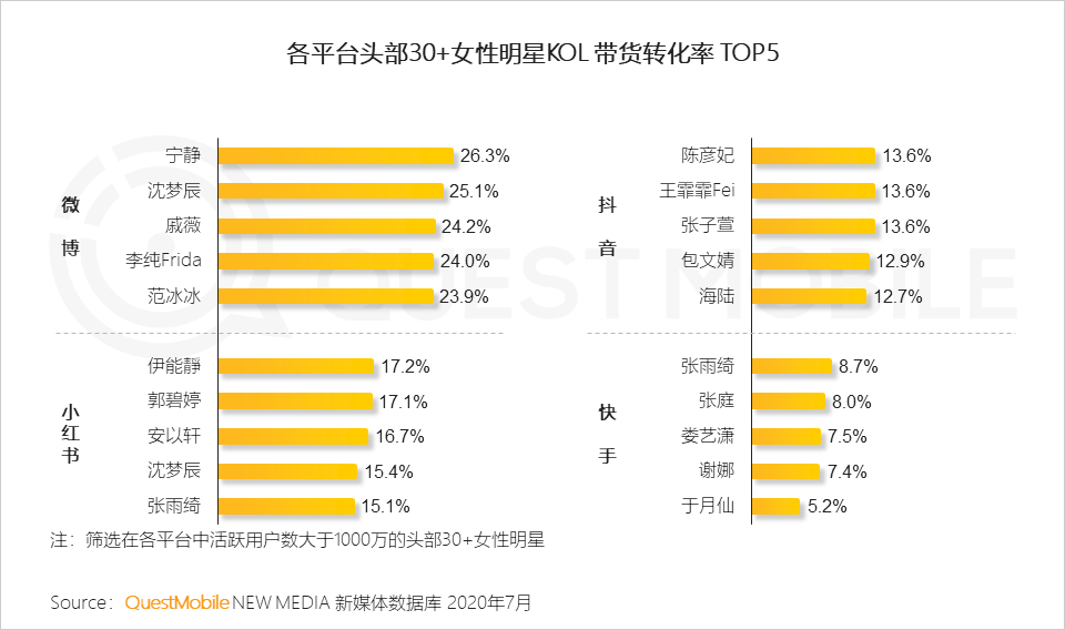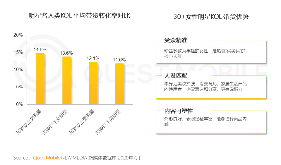 4、基于“带货”的商业模式:30+女性明星KOL相比于其他类型的明星,带货转化力更高,商业潜力更强
