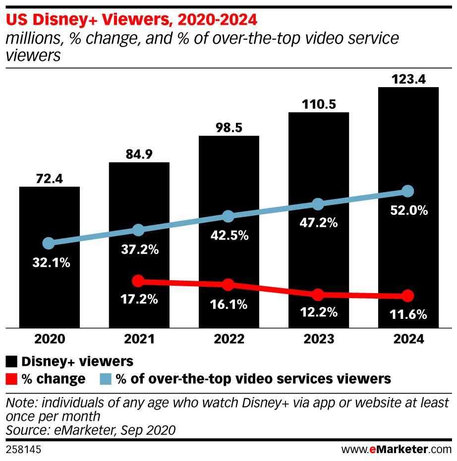 在eMarketer的预测期结束之前,这项服务每年都将经历两位数的增长。到2024年,美国迪士尼+的观众数量将超过Hulu,分别为1.234亿人和1.156亿人。