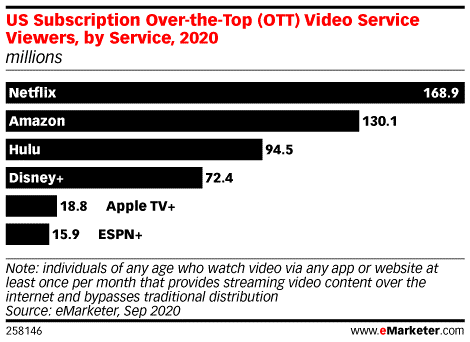 Netflix仍然是美国最大的订阅流媒体服务,拥有1.689亿观众,亚马逊Prime Video以1.301亿用户紧随其后。