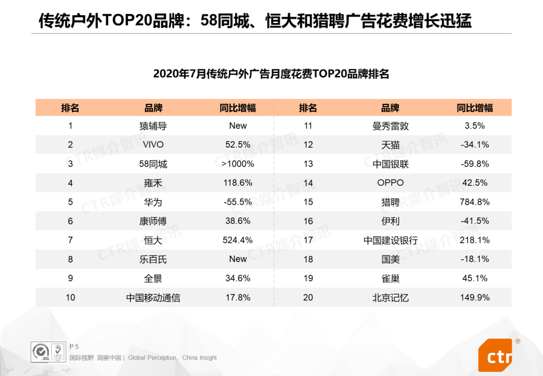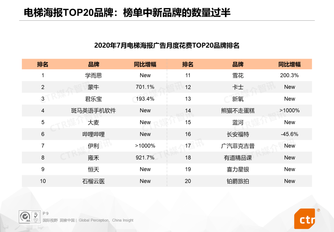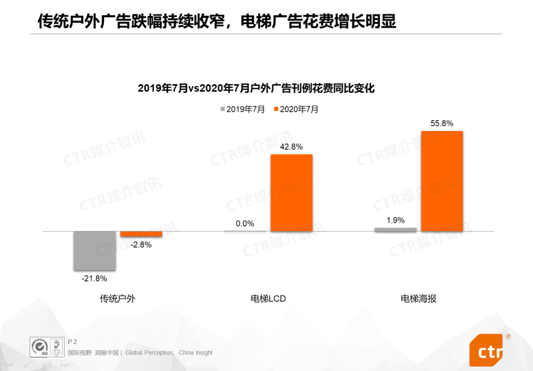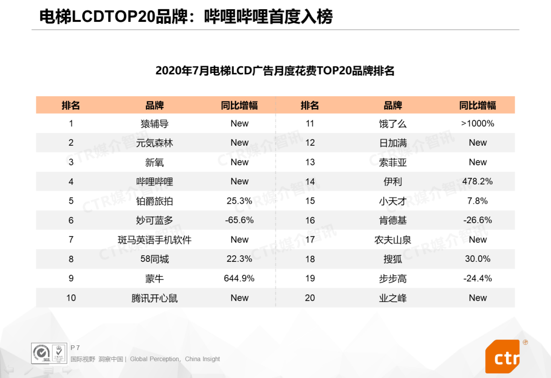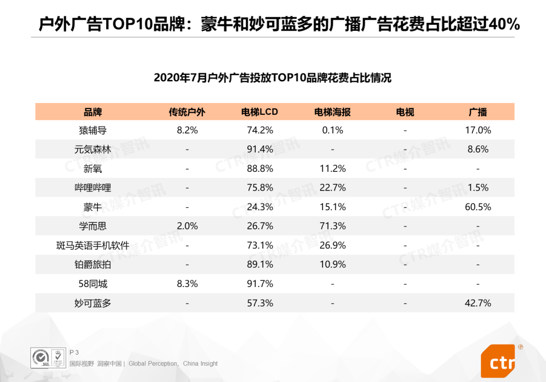 根据CTR媒介智讯的数据显示,2020年7月,传统户外广告花费同比下滑2.8%,降幅较去年同期收窄了近20个百分点。电梯LCD和电梯海报广告花费增长明显,增幅分别达42.8%和55.8%。户外广告TOP10品牌中,七成品牌同时在电梯LCD和电梯海报进行广告投放,哔哩哔哩作为新面孔入榜。乳品品牌蒙牛和妙可蓝多的广播广告花费占比超过40%。