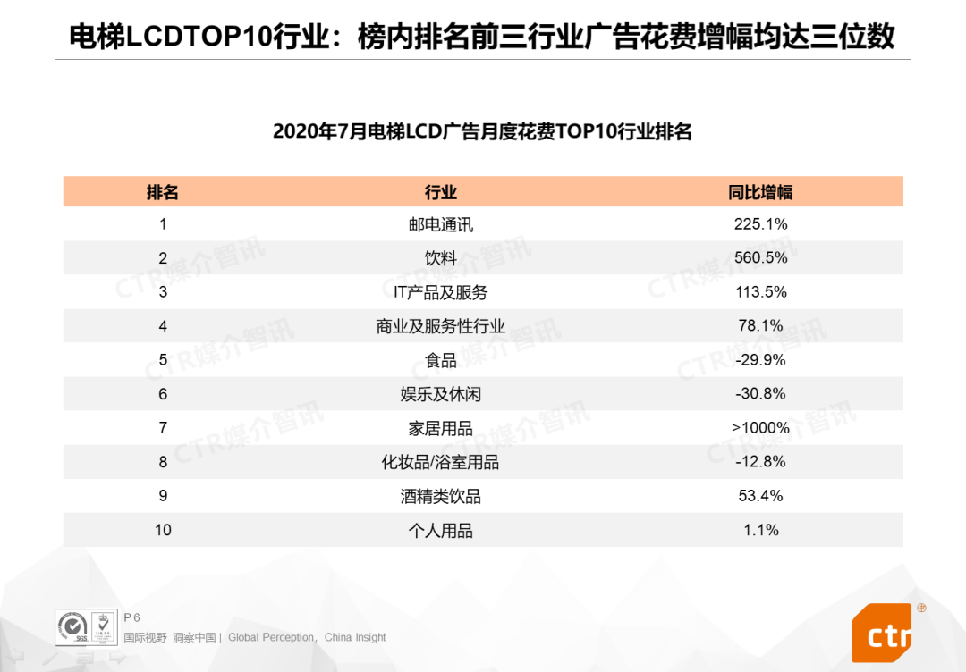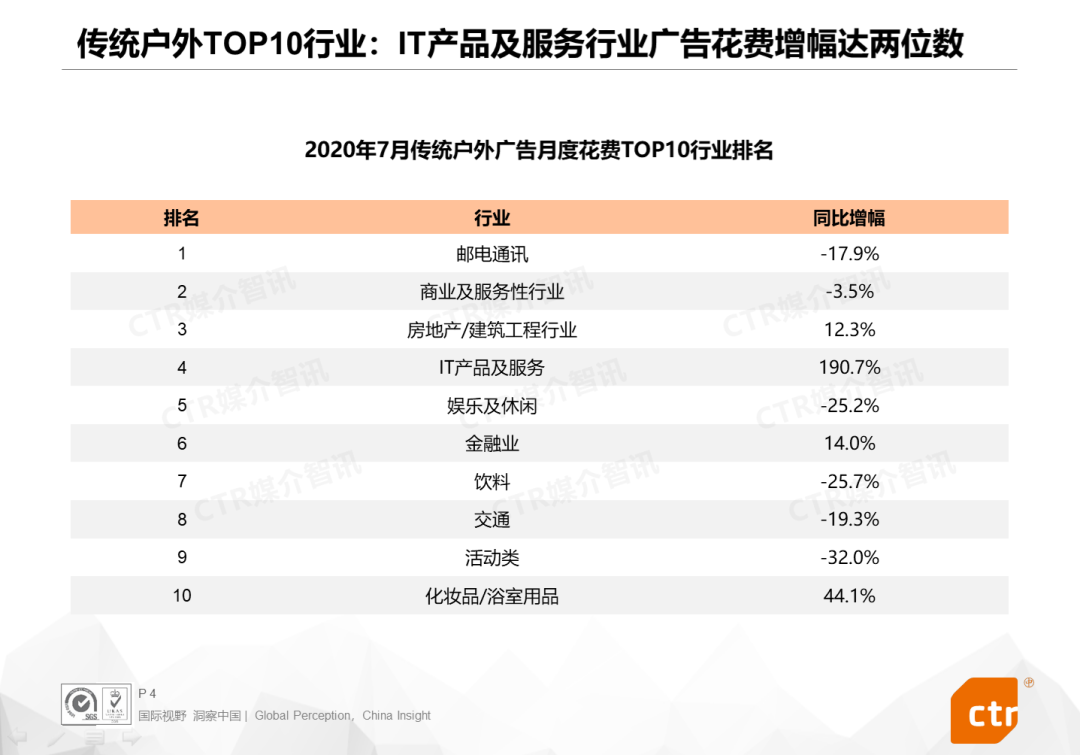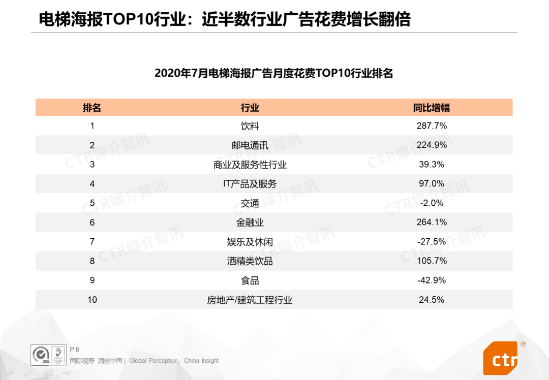 7月,IT产品及服务行业同时跻身传统户外、电梯LCD和电梯海报行业花费榜单前五,广告花费增幅分别为190.7%、113.5%和97.0%,主要得益于多个生活服务类软件的花费增投。