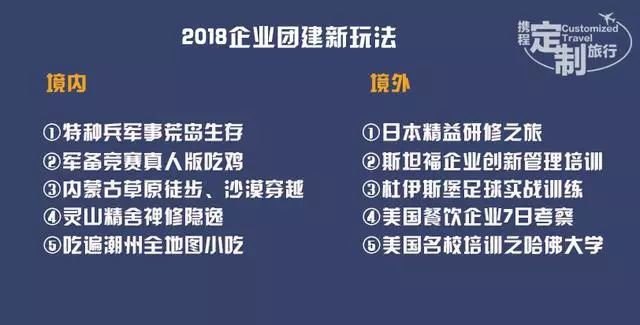 从2018上半年团建新玩法来看,主要分三大类,一类是放松休闲,比如禅修、美食之旅,一类是拓展活动,比如荒岛求生、草原徒步、沙漠穿越,还有一类是海外学习考察类的团建主题,比如企业考察、名校培训等。