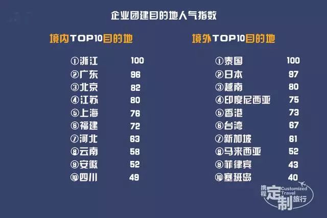 企业定制境内目的地前十为浙江、广东、北京、江苏、上海、福建、河北、云南、安徽、四川。境外的目的地前十为泰国、日本、越南、印度尼西亚、香港、台湾、新加坡、马来西亚、菲律宾、塞班岛。企业团建定制游的目的地境内和境外的比例为8:2。