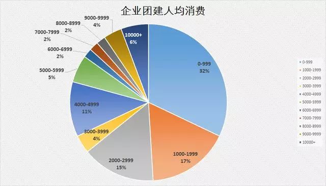 从总体上来看,企业团建人均消费在1000元以下的占比最多,占32%;人均消费10000元以上的团建占比6%。其中,金融保险行业、房地产业、计算机互联网行业最舍得花钱。