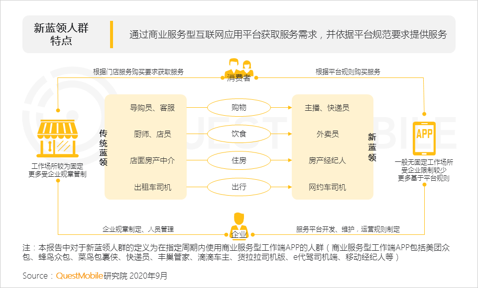 今天跟大家分享一下新蓝领人群洞察。过去十余年,城市化发展、互联网平台影响持续深入,新蓝领阶层正在形成,在“购、食、住、行”四个层面,与数字经济结合紧密,发展出了大量新的产业结构:主播、快递员、外卖骑手、网约车司机、房产经纪人……这些人成为城市主体就业人群之一,互联网应用平台,也取代了传统企业,成为管理他们工作的平台方,通过互联网平台,像齿轮一样,补充了城市管理运转中存在的bug,让城市运转更顺畅、效率更高,所以,为何会有人会说,与他们悲喜不相通呢?
