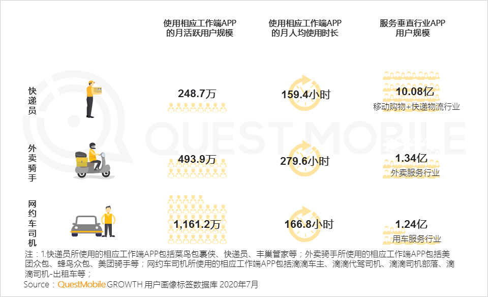 可能限于职业,这个群体以男性为主,尤其是外卖骑手,更偏向年轻未婚人群,网约车司机则主要为年长已婚人士。80后及90后为新蓝领的主力人群,合计占比近70%,同时,随着00后的陆续加入,该群体也越发年轻化。具体到典型人群上看,快递员使用工作端APP月活用户约为248.7万,外卖骑手使用工作端APP月活用户约为493.9万,网约车司机使用工作端APP月活跃用户约为1161.2万。