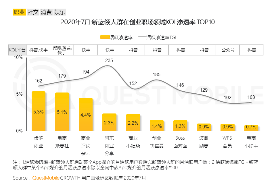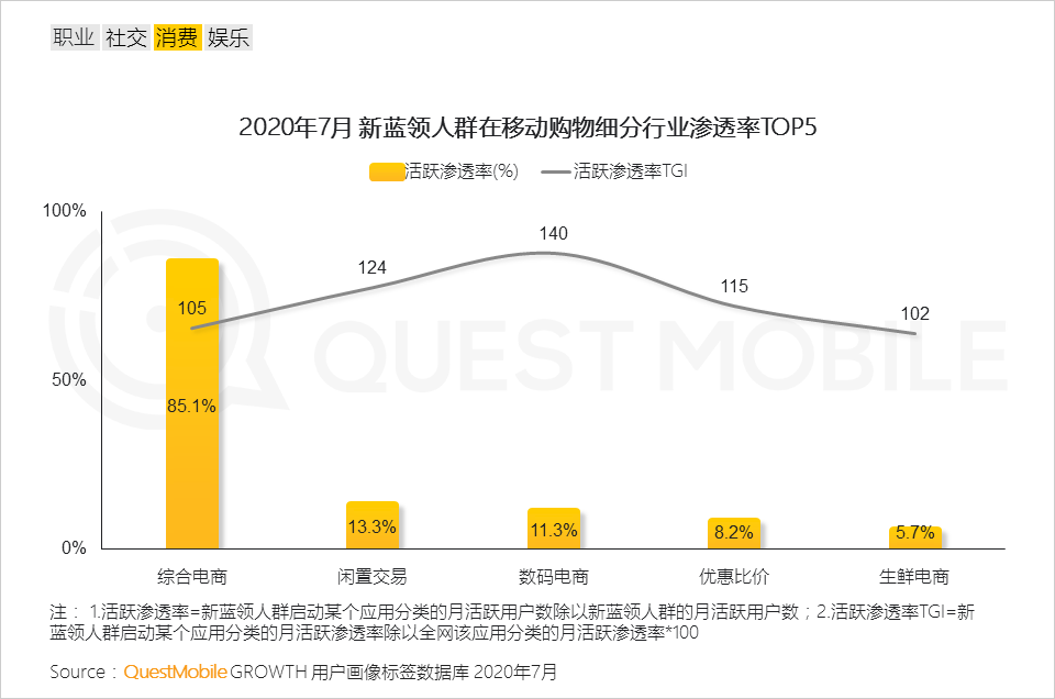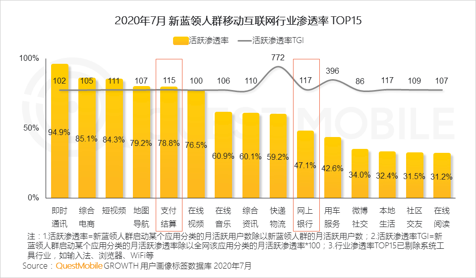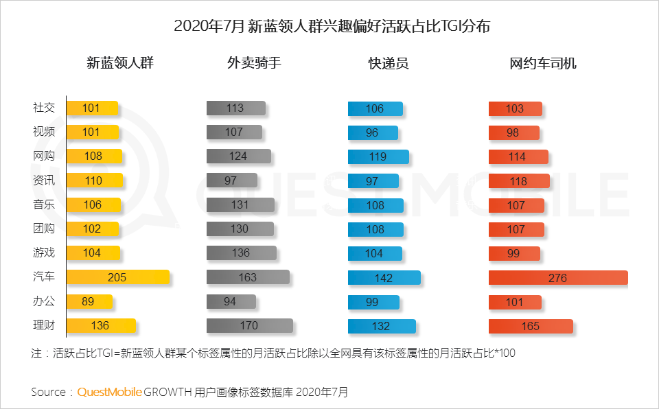 这部分群体对线上生活的掌握程度、依赖度也非常高,除了他们经常使用的快递物流、用车服务、本地生活等领域,在支付结算、网银等金融理财,地图导航等日常使用工具上,都有很高的黏性,同时,由于他们的工作特性,怀揣创业和职场的梦想,以及较高的学习热情,让他们对短视频、在线视频、在线音乐、综合资讯、在线阅读、社区交友等产品的使用上,都有很高的频次……