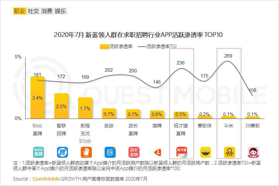 4、一二线城市市场需求巨大、机会更多,新蓝领人群活跃度更高;随着市场消费下沉,三线及以下城市新蓝领人群蕴含有巨大的职业增长潜力