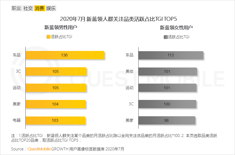 4.3 在消费关注品类上,车品成为男女新蓝领共同关注的重点,除此之外,男性用户热衷3C类产品,女性用户则更偏好美妆及运动类产品
