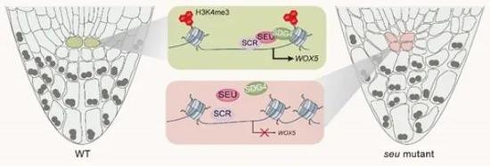 中国科学院遗传与发育生物学研究所研究员李传友研究组长期致力于根系可塑性发育的机理研究。其此前发现,逆境茉莉酸与生长素互作,通过改变干细胞活性调控根系的可塑性发育,且调控损伤诱导的组织修复和根系再生过程。该课题组最新研究表明,动植物中保守的LIM-domain binding(LDB)家族转录调控因子SEUSS(SEU)调控干细胞组织中心的命运决定。研究发现,seu突变体中WOX5表达显著下降,且该突变体与wox5突变体呈现类似的干细胞发育缺陷。深入研究表明,SEU作用于SHR/SCR通路正向调控WOX5表达和干细胞组织中心的建立。SEU通过与转录因子SCR直接互作而被招募到WOX5启动子;然后,SEU通过直接互作招募组蛋白甲基转移酶SDG4至WOX5启动子并诱导组蛋白H3第4位赖氨酸的三甲基化(H3K4me3),进而激活WOX5表达。该研究表明,SEU作为支架蛋白整合核心转录因子与表观遗传因子的功能, 形成SCR-SEU-SDG4转录复合体从而精确调控WOX5的时空特异表达和干细胞组织中心的命运决定。