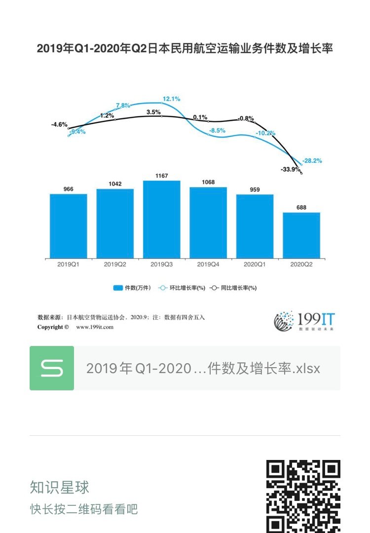 - 2019年Q1-2020年Q2日本民用航空运输业务重量及增长率(附原数据表)
