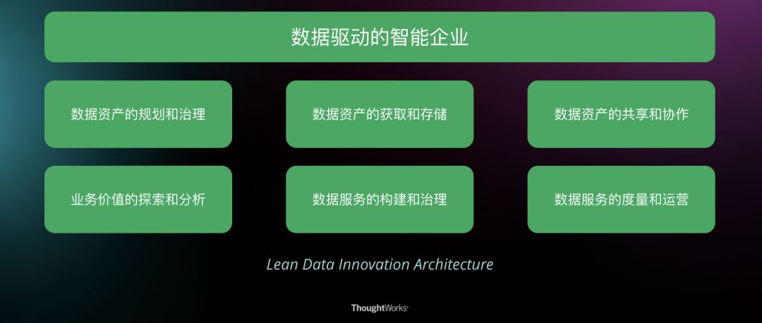 在 ThoughtWorks 提出的精益数据创新体系中将企业所需要具备的数据能力概括为以下六种,具备了这六种能力,企业才具备成为数据驱动的智能企业的基础,而这些能力的承载平台,就是数据中台: