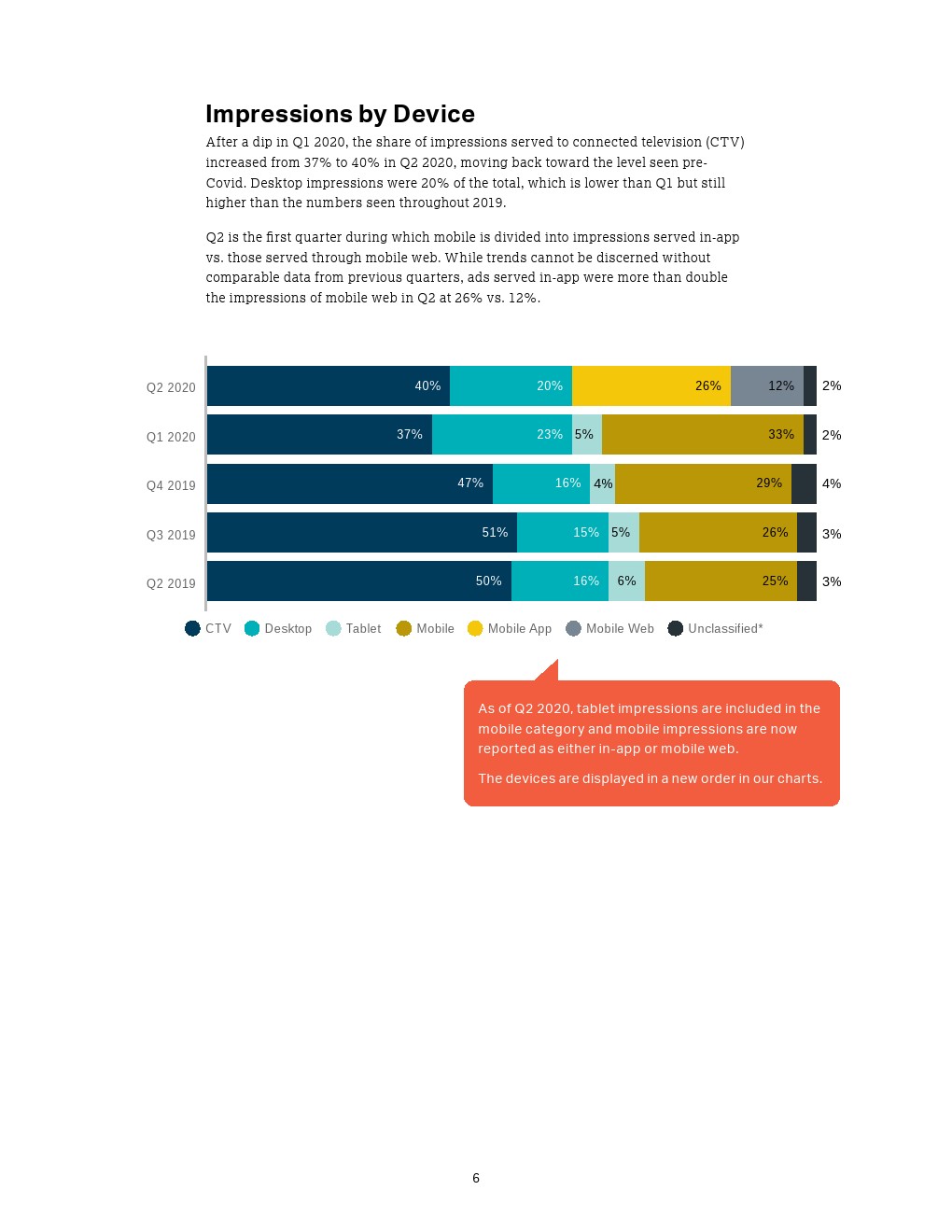 移动设备占视频广告展现量的份额从2019年第二季度的25%上升到2020年第二季度的38%,但是这是每个季度稳步增长的结果。尽管如此,与2019年第二季度以来的每个季度一样,展现量中最大的份额(40%)来自联网电视广告。