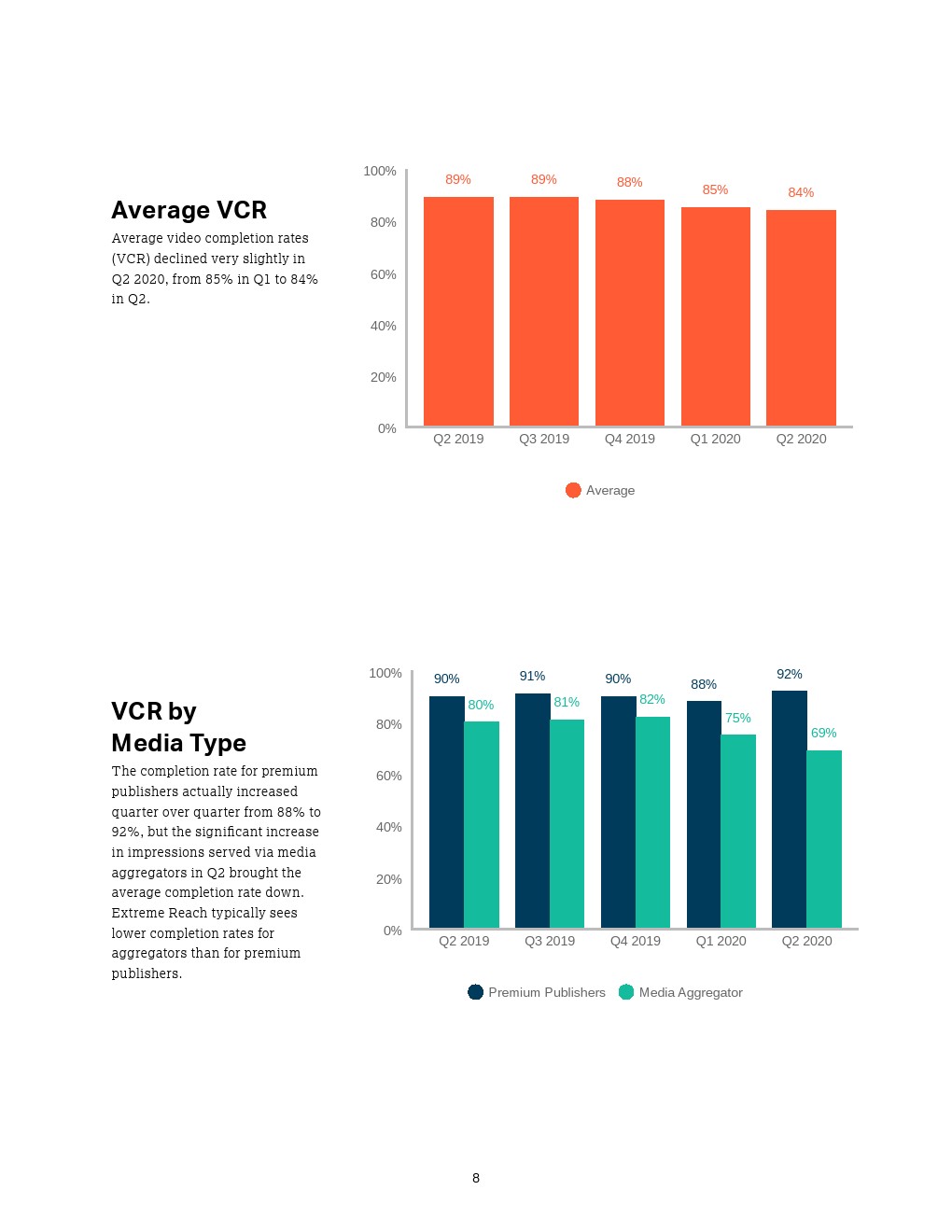- 平均视频完成率一直在稳步但温和下降,从去年同期的89%降至上个季度的84%。