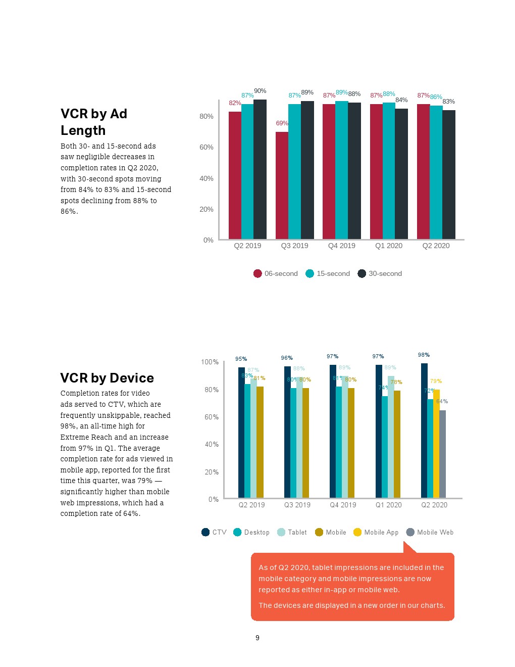与其他任何设备相比,第二季度联网电视的视频广告完成率再次位居榜首(98%),与2019年第二季度的95%相比略有上升。