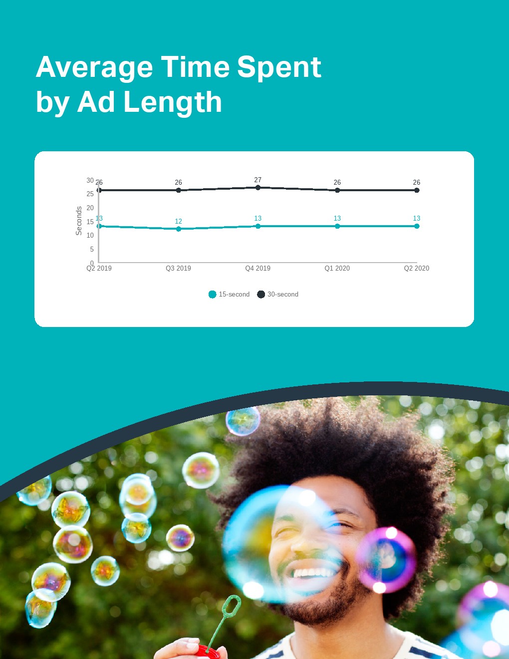 - 在过去一年里,观看15秒和30秒视频广告所花的时间几乎没有变化,目前这两个数字分别为13秒和26秒。