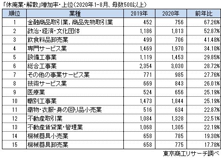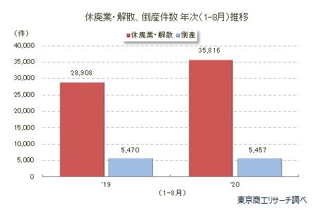 东京商工调查公司23日公布称,日本1至8月停业或解散的企业比上年同期增长23.9%,达35816家。新型冠状病毒疫情带来的业绩恶化成为打击,全年首次超过5万家的可能性上升。全国中小微企业约有358万家,其中1%的企业在1至8月期间撤退或消失。