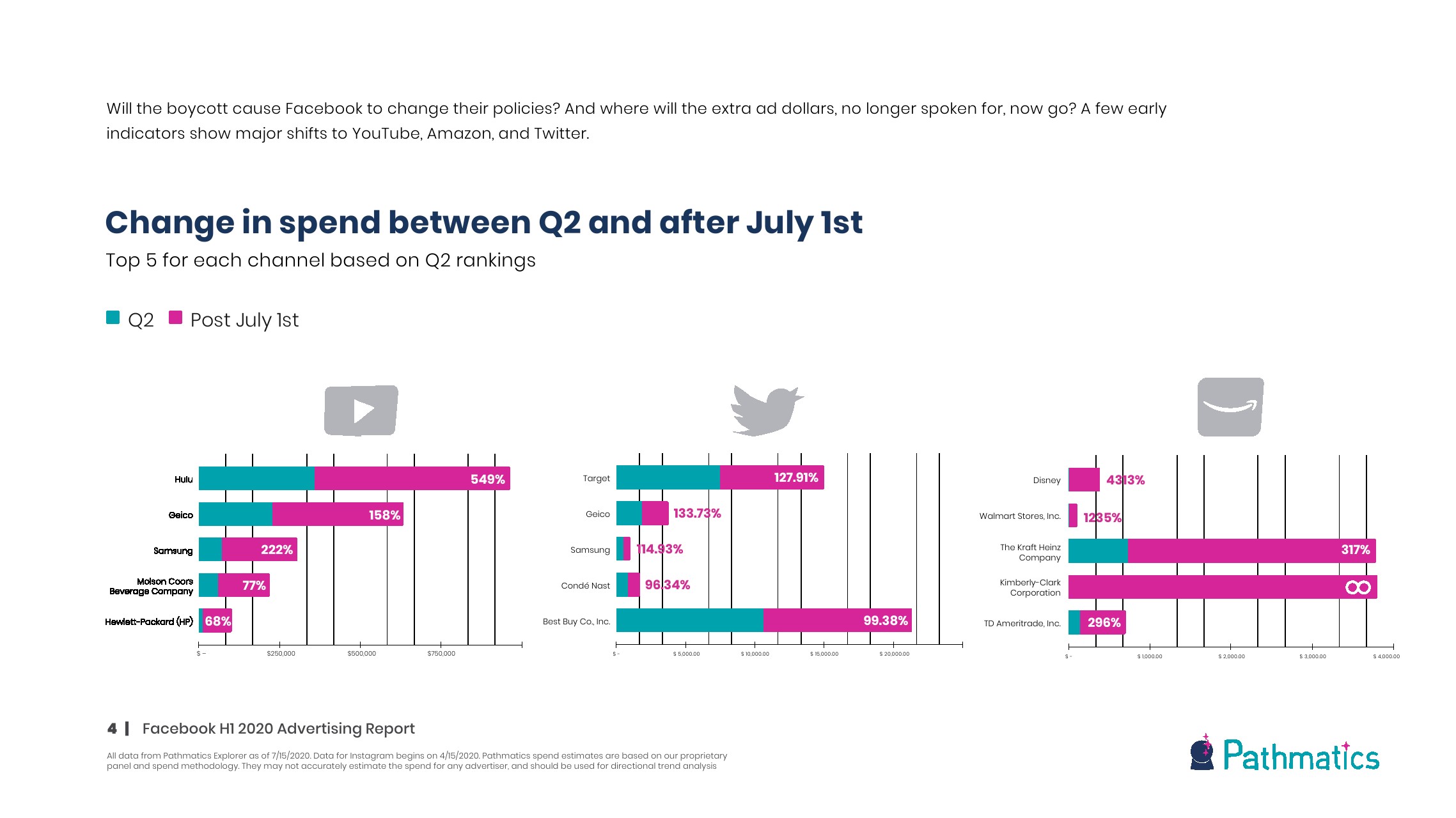 抵制Facebook的广告收入看起来好像被转移到了YouTube、Twitter和亚马逊。7月1日之后,仅迪士尼一家在亚马逊上的广告支出就增加了43倍以上。
