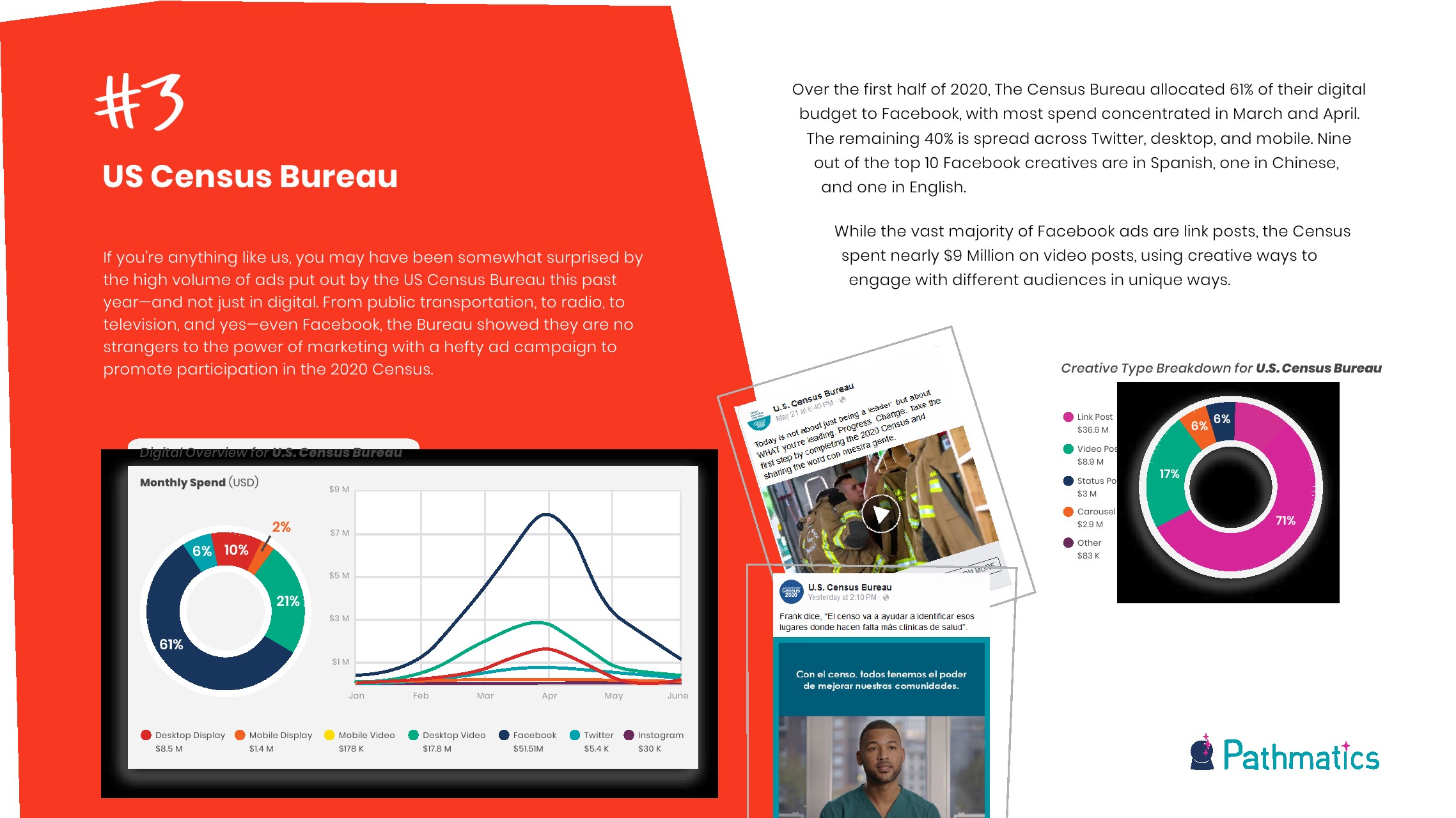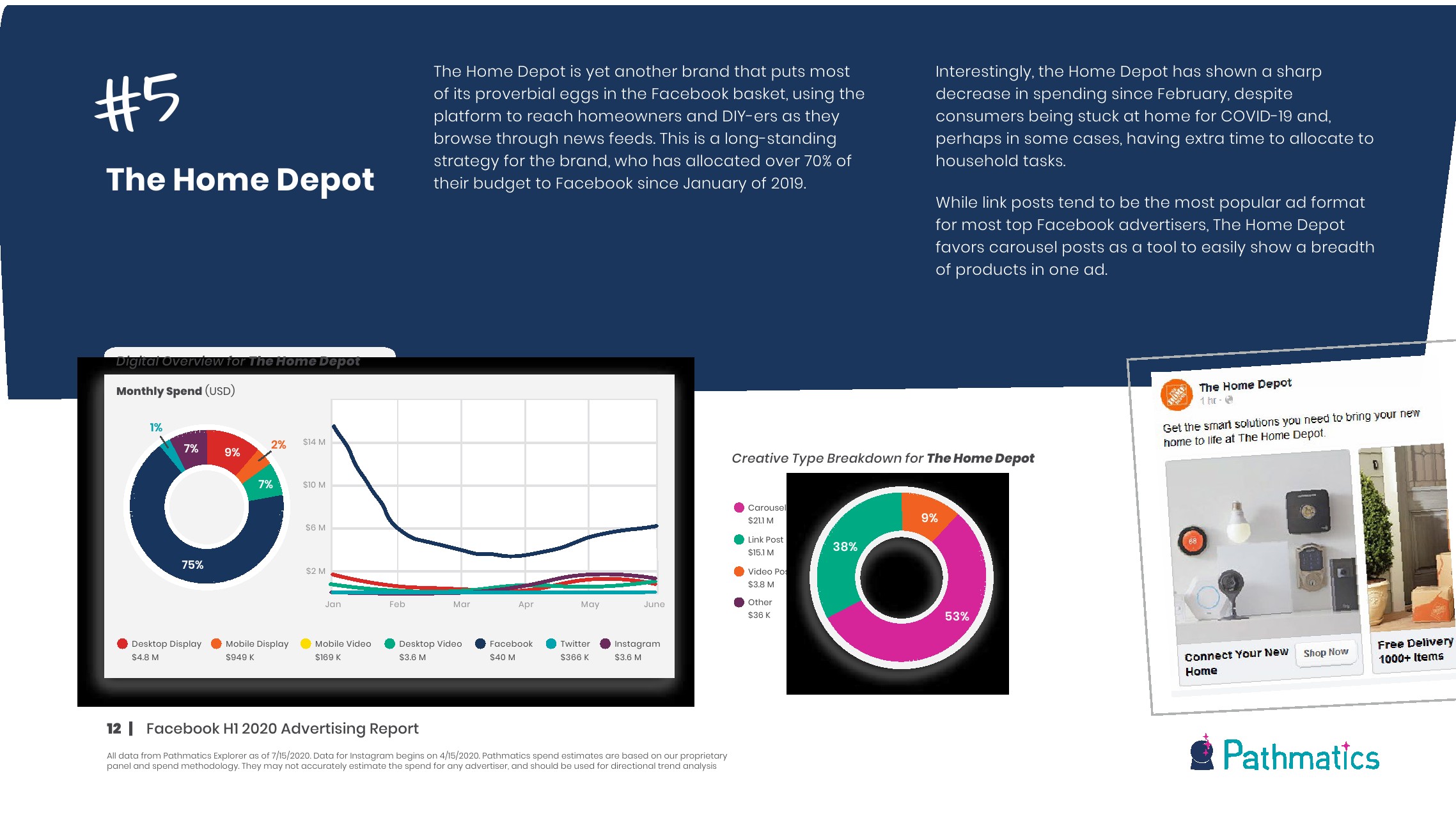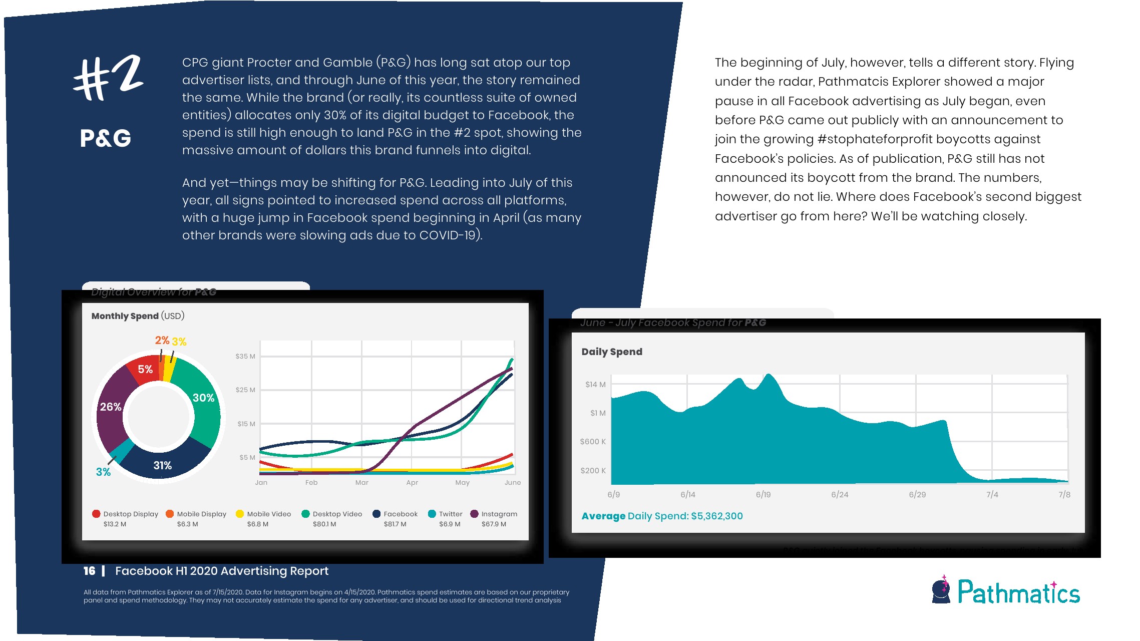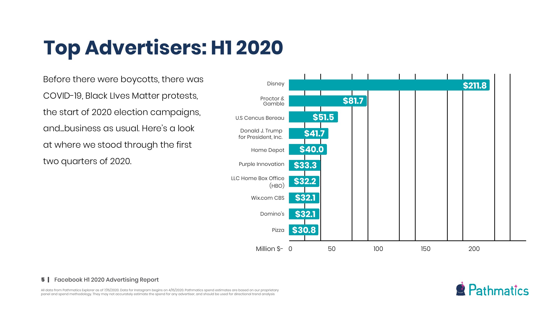 Pathmatics的数据显示,保洁在Facebook上投资8170万美元,还不到迪士尼的一半,是上半年Facebook的第二大广告主。紧随其后的是美国人口普查局(5150万美元),总统特朗普的公司(4170万美元)和家得宝(4000万美元)。