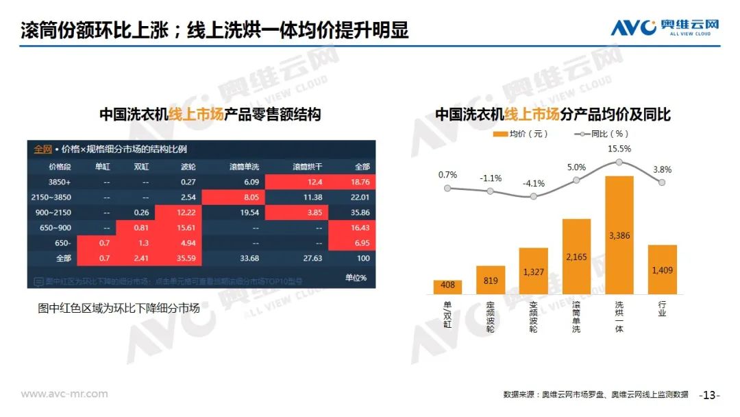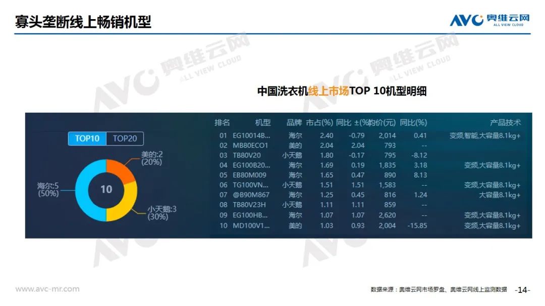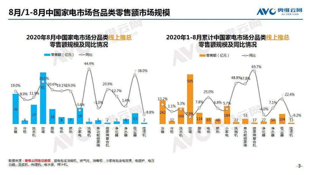 洗衣机:根据奥维云网(AVC)推总数据显示,2020年8月线上洗衣机市场零售量168万台,同比上涨9.4%;零售额23亿元,同比增长11.9%。监测均价上涨3.8个百分点,其中洗烘一体均价同比上涨15.5%,成为均价上涨的主要拉动力量。细分产品类型,8月滚筒份额环比上涨1.4%,波轮份额环比下滑0.9%。在爆款机型表现中,海尔、小天鹅、美的三分天下,分别有5、3、2款机型入围。