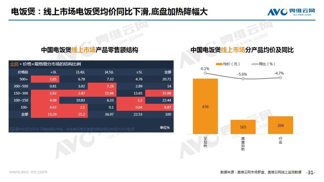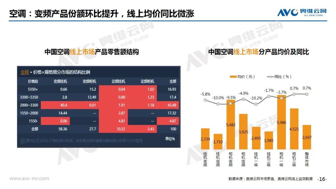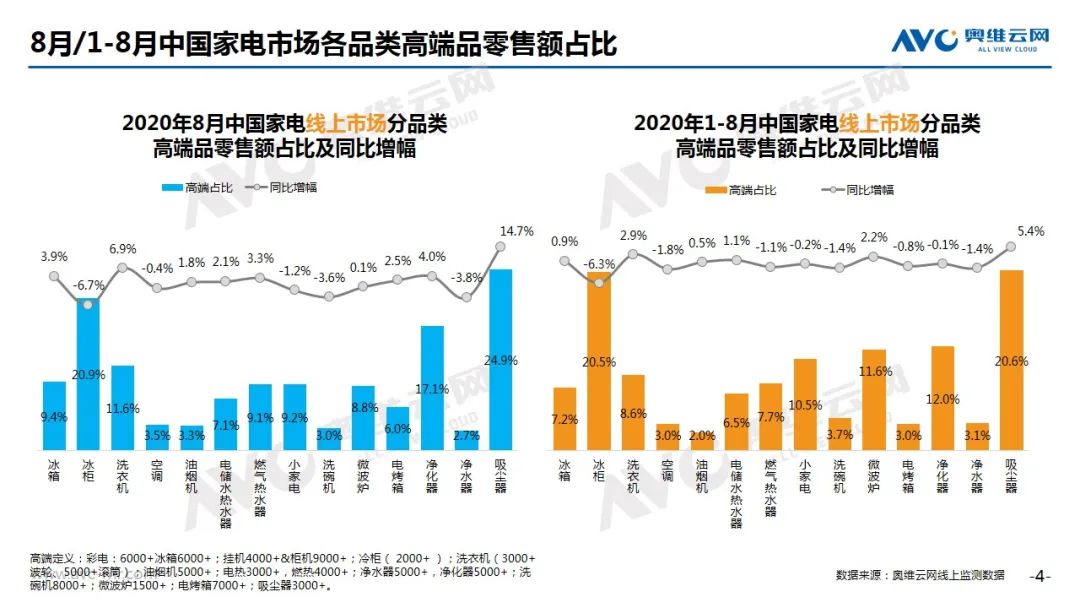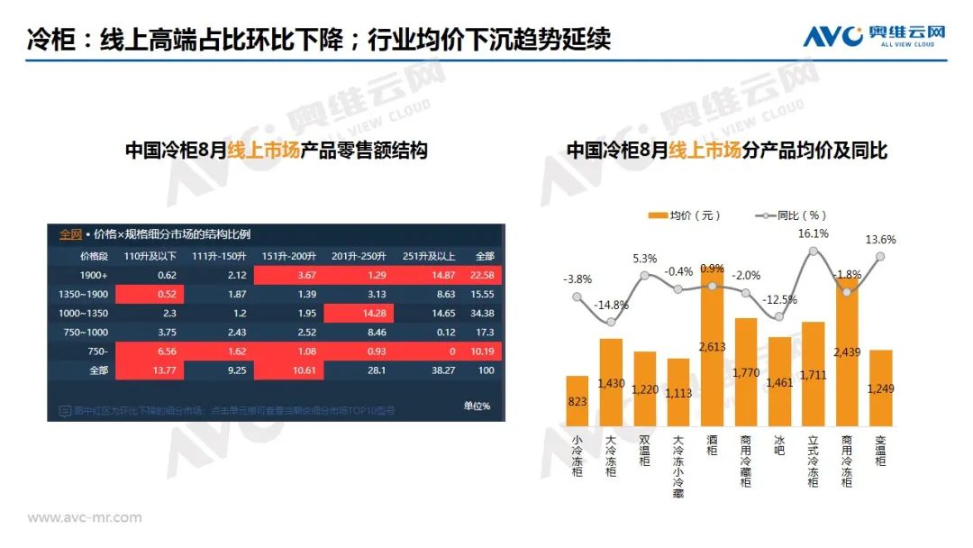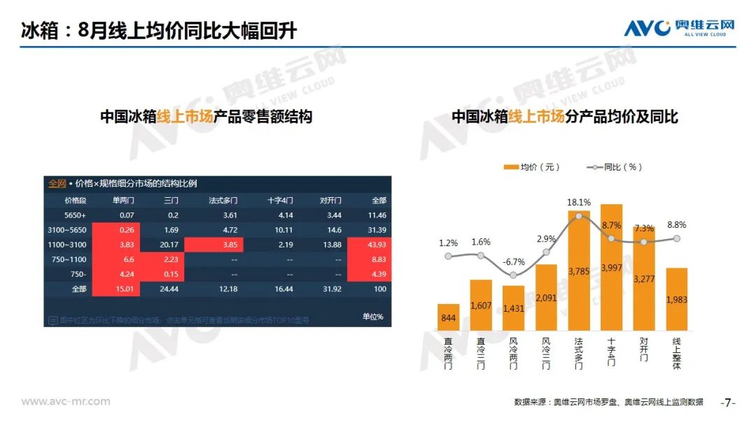 冰箱:奥维云网(AVC)线上推总数据显示,2020年8月冰箱线上市场零售量为196万台,同比增长13.7%,零售额为36亿元,同比增长19.0%。从细分市场看,TOP内资企业积极进行结构调整,法式、十字、对开均价较同期有显著回升,同比涨幅分别为18.1%、8.7%和7.3%。从需求看,线上对低端直冷产品的需求仍然存在,但内资企业的价格调整或将扭转线上市场价格一探再探的局面。