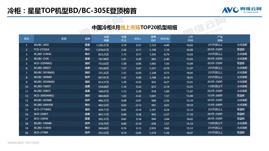 冷柜:8月冰柜线上市场同比持续上升。根据奥维云网(AVC)推总数据显示,2020年8月冰柜线上市场零售量为37.4万台,同比上升24.3%,零售额为4.3亿元,同比上升8.9%。分产品类型来看,主要品类小冷冻柜和大冷冻柜零售额同比分别上升42.9%和上升15.4%;大冷冻小冷藏表现良好,零售额同比上升36.8%。在客厅柜中,冰吧零售额同比上升18.8%,酒柜零售额同比下滑29.3%;立式冷冻柜销售火爆,零售额同比上升123.2%。