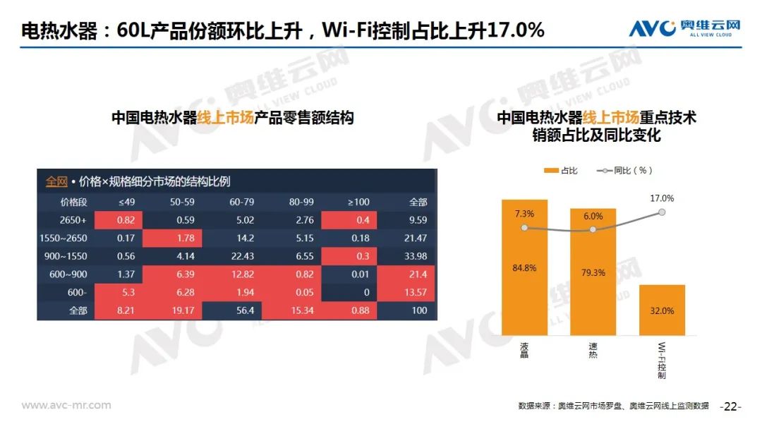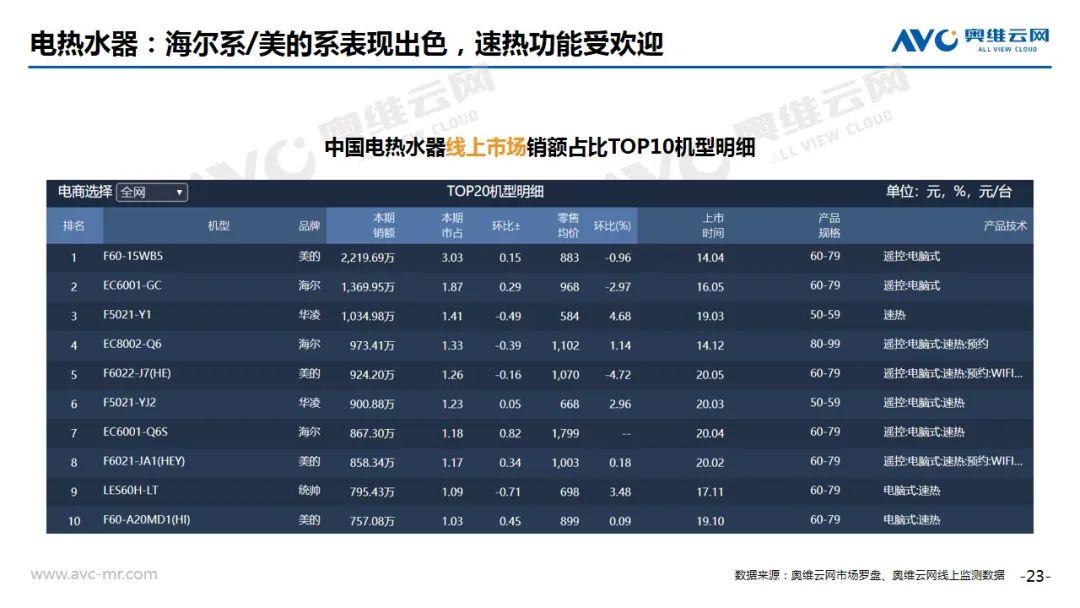 电储水热水器:根据奥维云网(AVC)推总数据显示,2020年8月电储水热水器市场零售额为8.2亿元,同比增长19.1%。从技术角度来看,60L产品份额环比上升,Wi-Fi控制占比上升17.0%。TOP机型中,海尔系/美的系数量加多,速热仍然是主要宣传卖点。