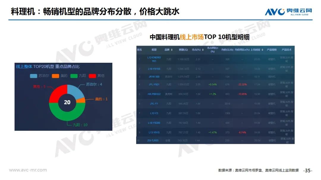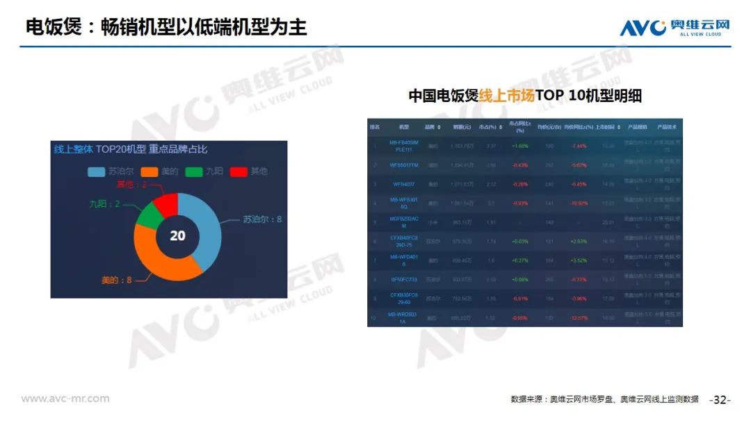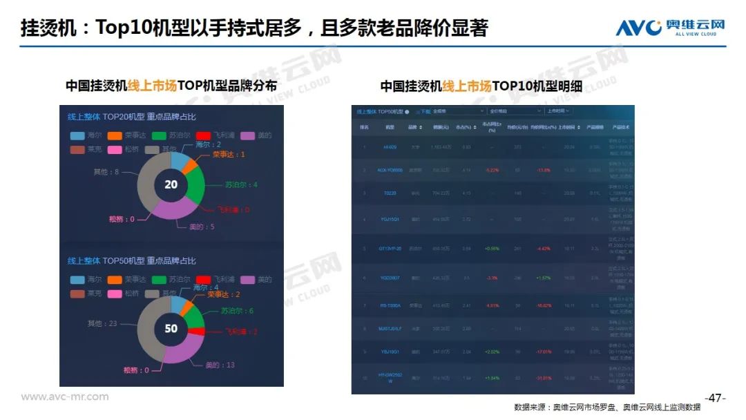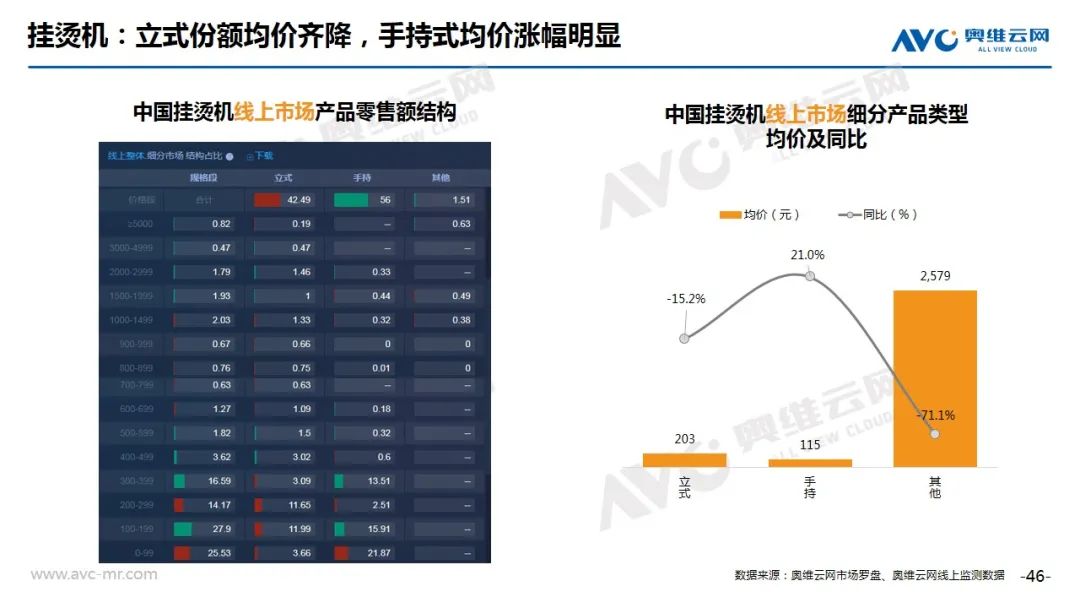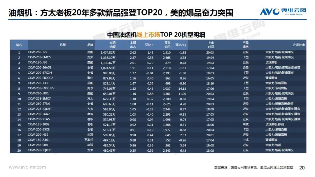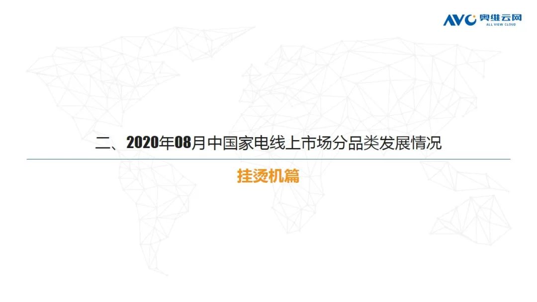 挂烫机:根据奥维云网(AVC)线上推总数据显示,2020年8月份,挂烫机线上市场零售额规模1.6亿元,同比下滑8.8%,零售量112万台,同比下滑11.2%。分产品类型看,手持占比提升,均价上涨,立式占比降低,均价下滑;从Top20机型分布来看,美的、苏泊尔分别有5款和4款产品入榜,大宇、华光、米家等新品成功冲入Top榜单,但整体来看,老品仍然占有很高比重。