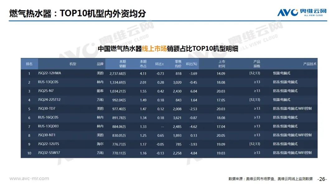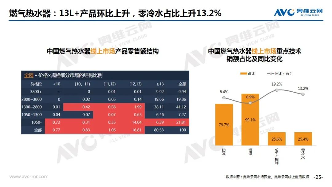 燃气热水器:根据奥维云网(AVC)推总数据显示,2020年8月燃气热水器市场零售额为7.1亿元,同比上升19.0%。从技术角度来看,13L+产品环比上升,零冷水占比上升13.2%。TOP10机型内外资均分,恒温、防冻受欢迎。