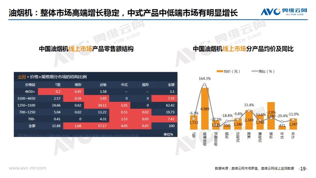 油烟机:8月油烟机线上市场销售规模相较去年迎来了大幅提升,行业发展迅速。根据奥维云网(AVC)推总数据显示,2020年8月油烟机线上市场零售量为80.8万台,同比上升33.6%,零售额为9.6亿元,同比增长18.8%。本月产品迭代速度加快,有27款机型新晋行业TOP50。与此同时,线上市场价格战日益激烈,油烟机的均价迎来了下滑,据奥维云网(AVC)监测数据显示,2020年8月线上均价同比下滑11.0%,均价为1347元。这一点在价格段结构上也得到了体现, 999元以下的油烟机市场零售额结构性占比同比上涨2.7%,5000+结构性占比上涨1.3%。从品类结构发展来看,中式烟机和侧吸式烟机获得了小幅增长,2020年8月结构性占比分别达到了4.1 %和57.2%,同比分别上涨了0.3%和0.8%。