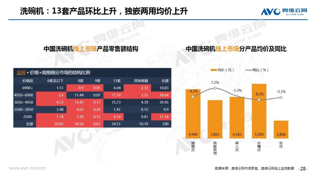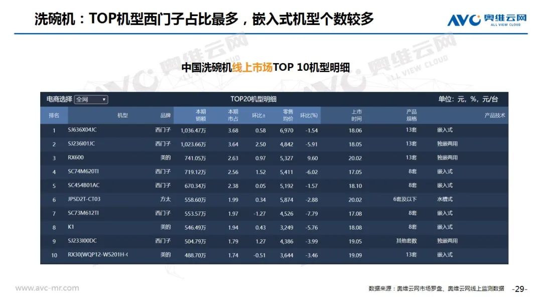 洗碗机:2020年8月洗碗机增长趋势较好,根据奥维云网(AVC)线上推总数据显示,零售额2.7亿元,同比上升44.9%。13套产品环比上升,独嵌两用均价上升。TOP机型西门子占比最多,嵌入式机型个数较多。