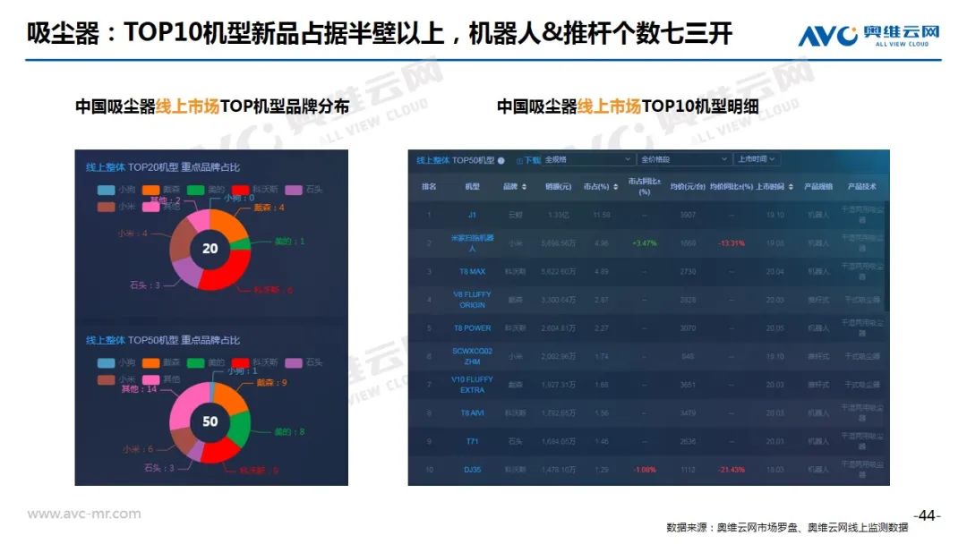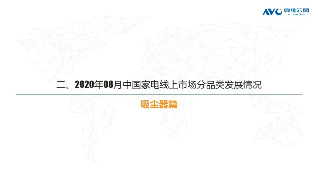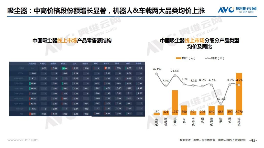 吸尘器:8月吸尘器线上市场销售规模大幅增长,根据奥维云网(AVC)线上推总数据显示,2020年8月份,吸尘器线上市场零售额规模12.9亿元,同比增长38.0%,零售量176万台,同比增长22.8%。分产品类型看,扫地机器人份额继续扩大,达到51.4%,份额增长的同时,整体均价继续上涨,同比增长21.6%;分价格段看,2500以上中高价格段段增长显著;Top10机型分布来看,推杆和机器人霸榜,且今年新品居多。