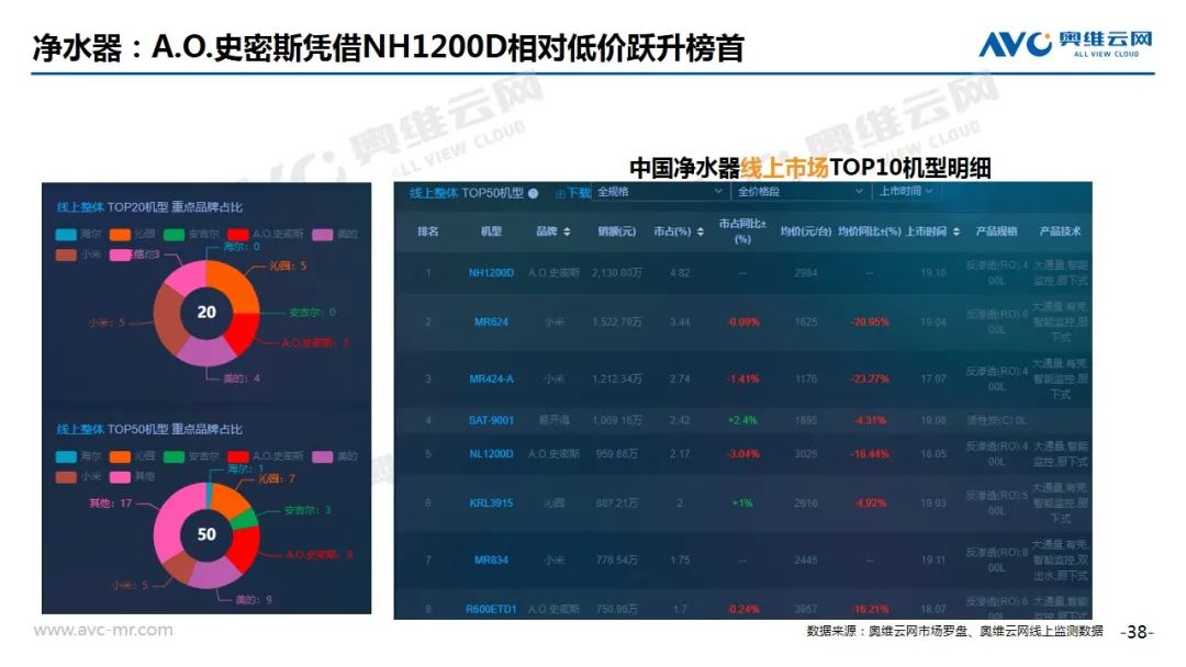 净水器:2020年8月净水器线上市场整体表现相对稳定,未能借助818活动拉动线上市场销额,据奥维云网(AVC)线上推总数据显示,8月份净水器线上规模6.1亿元,同比增长1.4%,销量43.1万台,同比增长6.5%。从监测数据情况来看,线上市场高配低价的策略未有太大改善,但品牌间竞争烈度有所提升,其中A.O.史密斯凭借高配低价产品跃居本月榜首。