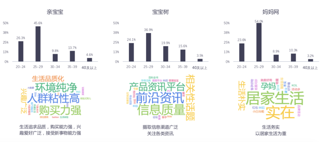 其中,亲宝宝人群表现为生活追求品质,购买能力强,善于接受新鲜事物,容易被 “种草”,是不折不扣的精挑细选的“美好生活创作家”;宝宝树人群表现为关注各类资讯的 “信息收集官”;而妈妈网人群则是朴实又实在的“小镇妈妈”形象。
